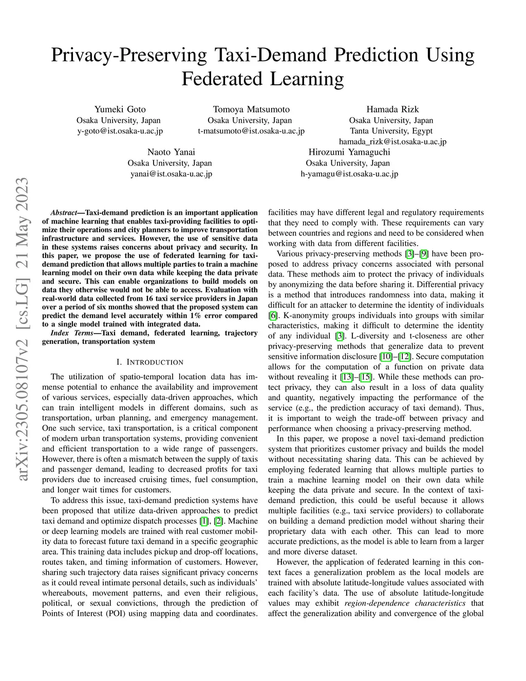Taxi-demand prediction is an important application of machine learning that enables taxi-providing facilities to optimize their operations and city planners to improve transportation infrastructure and services. However, the use of sensitive data in these systems raises concerns about privacy and security. In this paper, we propose the use of federated learning for taxi-demand prediction that allows multiple parties to train a machine learning model on their own data while keeping the data private and secure. This can enable organizations to build models on data they otherwise would not be able to access. Evaluation with real-world data collected from 16 taxi service providers in Japan over a period of six months showed that the proposed system can predict the demand level accurately within 1\% error compared to a single model trained with integrated data.