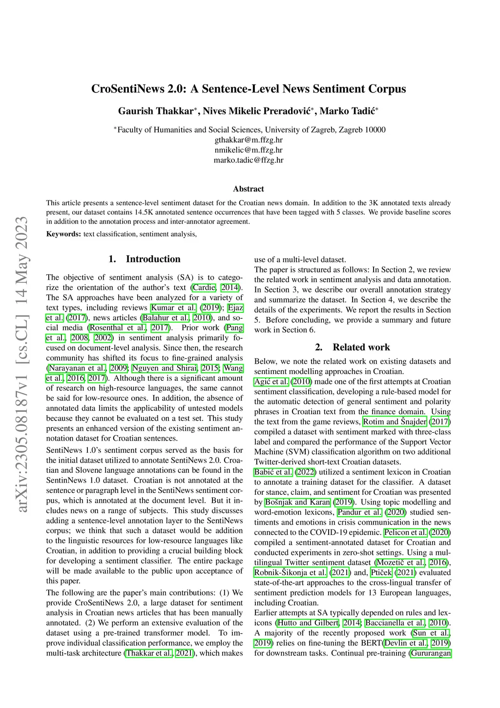 This article presents a sentence-level sentiment dataset for the Croatian news domain. In addition to the 3K annotated texts already present, our dataset contains 14.5K annotated sentence occurrences that have been tagged with 5 classes. We provide baseline scores in addition to the annotation process and inter-annotator agreement.