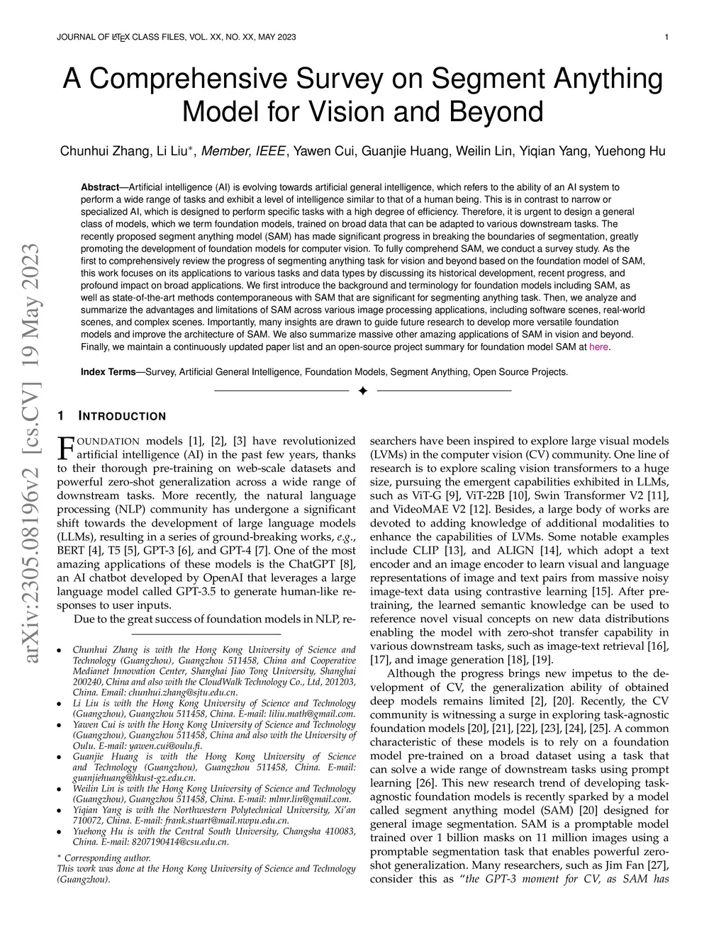 Artificial intelligence (AI) is evolving towards artificial general intelligence, which refers to the ability of an AI system to perform a wide range of tasks and exhibit a level of intelligence similar to that of a human being. This is in contrast to narrow or specialized AI, which is designed to perform specific tasks with a high degree of efficiency. Therefore, it is urgent to design a general class of models, which we term foundation models, trained on broad data that can be adapted to various downstream tasks. The recently proposed segment anything model (SAM) has made significant progress in breaking the boundaries of segmentation, greatly promoting the development of foundation models for computer vision. To fully comprehend SAM, we conduct a survey study. As the first to comprehensively review the progress of segmenting anything task for vision and beyond based on the foundation model of SAM, this work focuses on its applications to various tasks and data types by discussing its historical development, recent progress, and profound impact on broad applications. We first introduce the background and terminology for foundation models including SAM, as well as state-of-the-art methods contemporaneous with SAM that are significant for segmenting anything task. Then, we analyze and summarize the advantages and limitations of SAM across various image processing applications, including software scenes, real-world scenes, and complex scenes. Importantly, some insights are drawn to guide future research to develop more versatile foundation models and improve the architecture of SAM. We also summarize massive other amazing applications of SAM in vision and beyond.