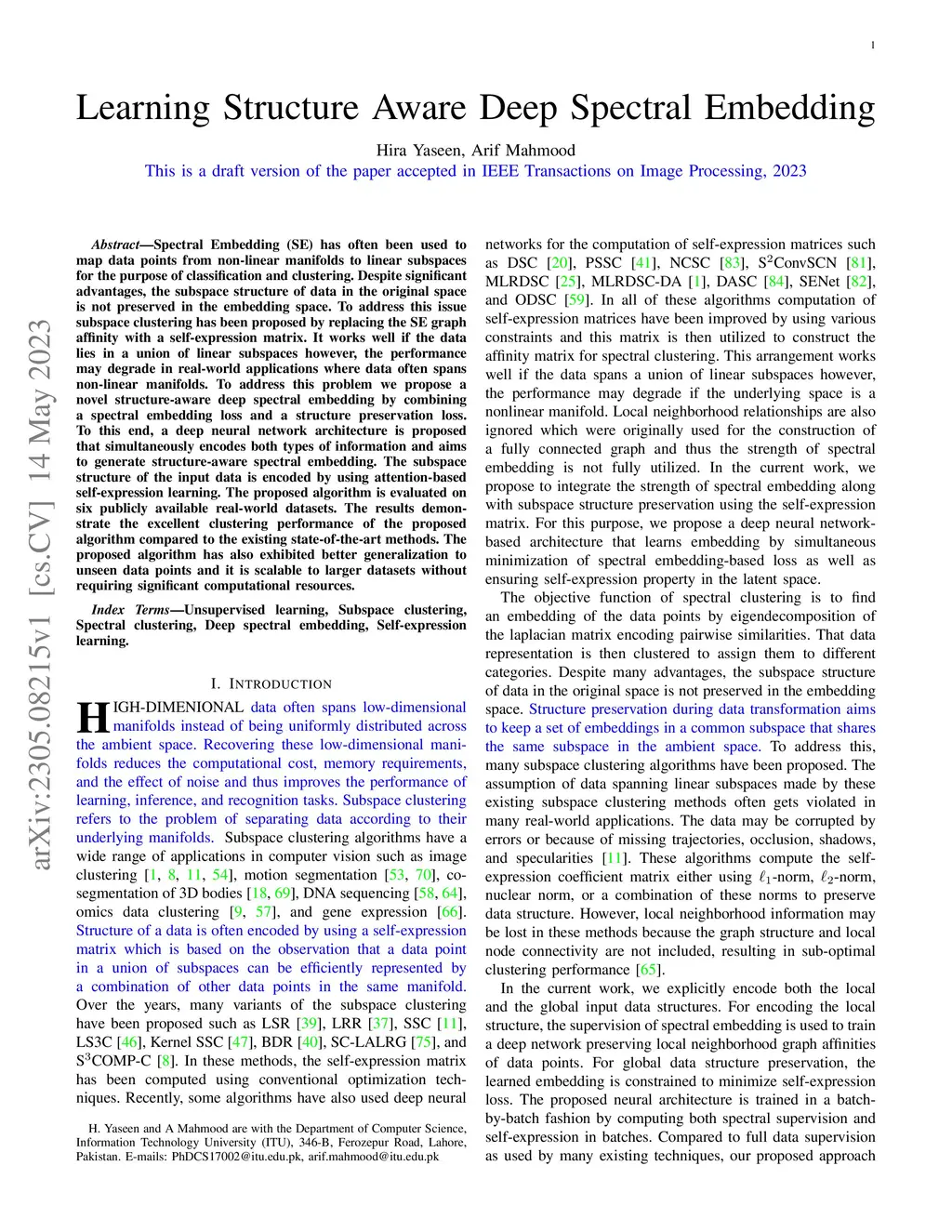 Spectral Embedding (SE) has often been used to map data points from non-linear manifolds to linear subspaces for the purpose of classification and clustering. Despite significant advantages, the subspace structure of data in the original space is not preserved in the embedding space. To address this issue subspace clustering has been proposed by replacing the SE graph affinity with a self-expression matrix. It works well if the data lies in a union of linear subspaces however, the performance may degrade in real-world applications where data often spans non-linear manifolds. To address this problem we propose a novel structure-aware deep spectral embedding by combining a spectral embedding loss and a structure preservation loss. To this end, a deep neural network architecture is proposed that simultaneously encodes both types of information and aims to generate structure-aware spectral embedding. The subspace structure of the input data is encoded by using attention-based self-expression learning. The proposed algorithm is evaluated on six publicly available real-world datasets. The results demonstrate the excellent clustering performance of the proposed algorithm compared to the existing state-of-the-art methods. The proposed algorithm has also exhibited better generalization to unseen data points and it is scalable to larger datasets without requiring significant computational resources.