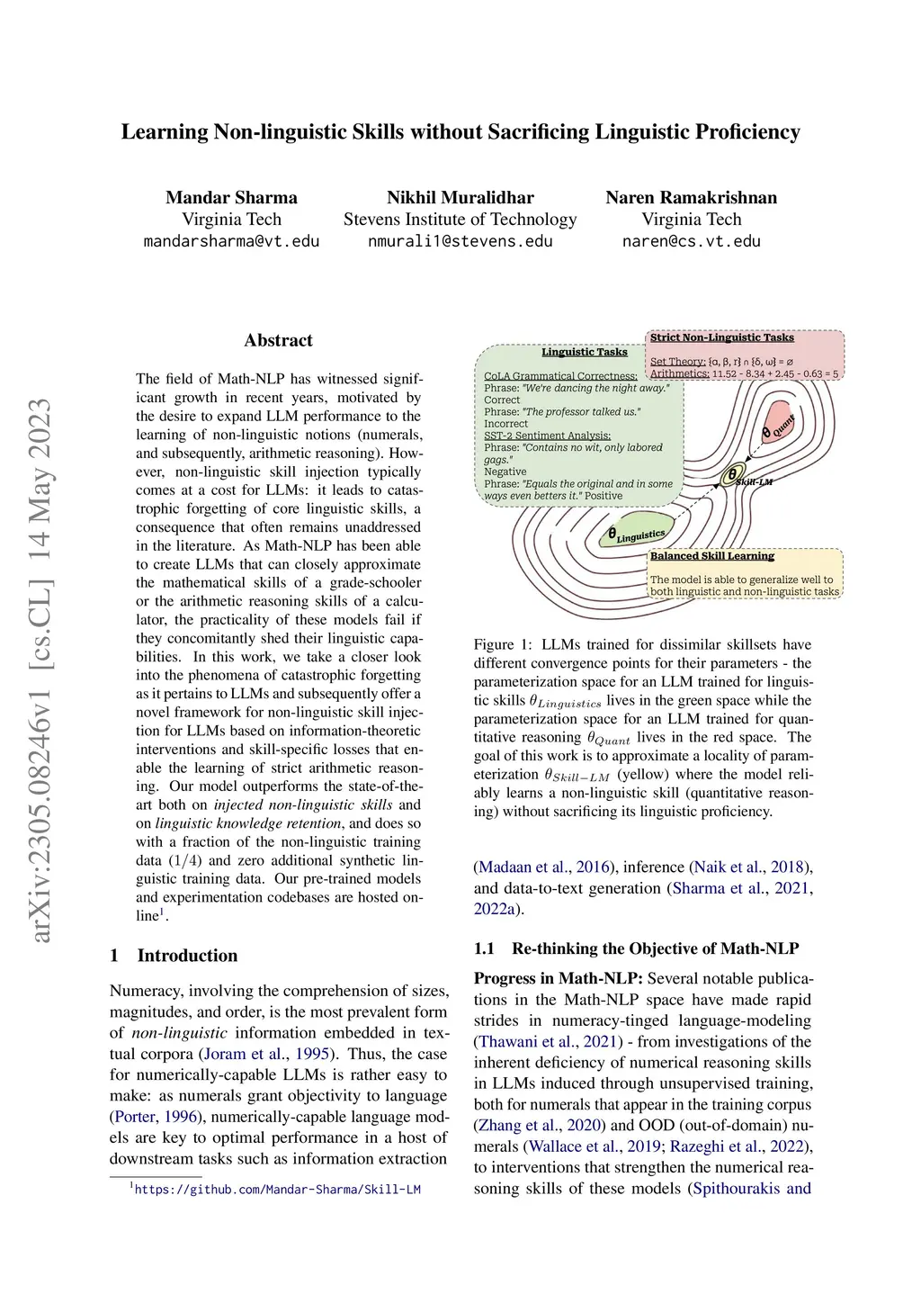 The field of Math-NLP has witnessed significant growth in recent years, motivated by the desire to expand LLM performance to the learning of non-linguistic notions (numerals, and subsequently, arithmetic reasoning). However, non-linguistic skill injection typically comes at a cost for LLMs: it leads to catastrophic forgetting of core linguistic skills, a consequence that often remains unaddressed in the literature. As Math-NLP has been able to create LLMs that can closely approximate the mathematical skills of a grade-schooler or the arithmetic reasoning skills of a calculator, the practicality of these models fail if they concomitantly shed their linguistic capabilities. In this work, we take a closer look into the phenomena of catastrophic forgetting as it pertains to LLMs and subsequently offer a novel framework for non-linguistic skill injection for LLMs based on information theoretic interventions and skill-specific losses that enable the learning of strict arithmetic reasoning. Our model outperforms the state-of-the-art both on injected non-linguistic skills and on linguistic knowledge retention, and does so with a fraction of the non-linguistic training data (1/4) and zero additional synthetic linguistic training data.