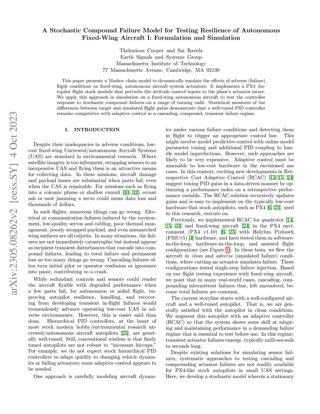 This paper presents a Markov chain model to dynamically emulate the effects of adverse (failure) flight conditions on fixed-wing, autonomous aircraft system actuators. It implements a PX4 Autopilot flight stack module that perturbs the attitude control inputs to the plane's actuator mixer. We apply this approach in simulation on a fixed-wing autonomous aircraft to test the controller response to stochastic compound failures on a range of turning radii. Statistical measures of the differences between target and simulated flight paths demonstrate that a well-tuned PID controller remains competitive with adaptive control in a cascading, compound, transient failure regime.