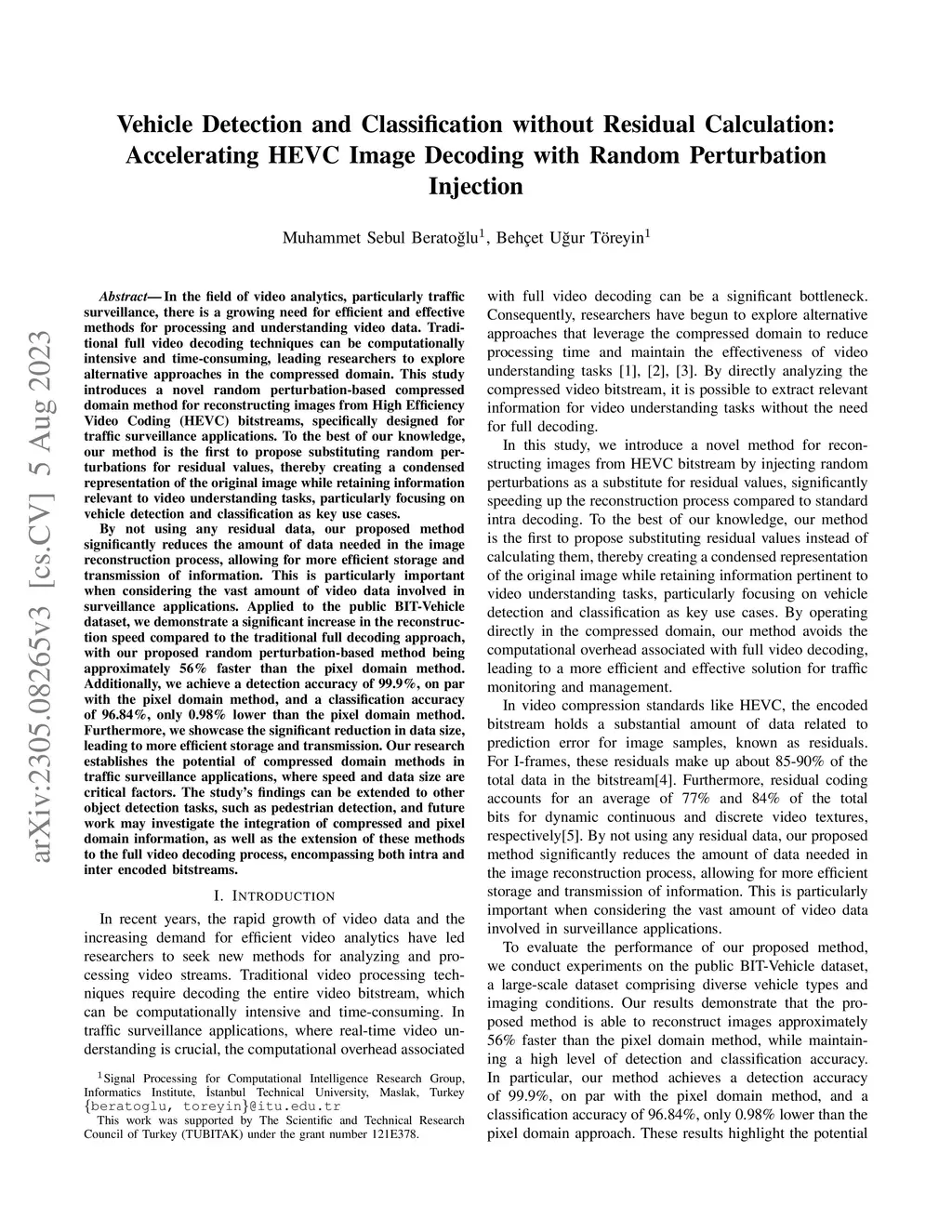In the field of video analytics, particularly traffic surveillance, there is a growing need for efficient and effective methods for processing and understanding video data. Traditional full video decoding techniques can be computationally intensive and time-consuming, leading researchers to explore alternative approaches in the compressed domain. This study introduces a novel random perturbation-based compressed domain method for reconstructing images from High Efficiency Video Coding (HEVC) bitstreams, specifically designed for traffic surveillance applications. To the best of our knowledge, our method is the first to propose substituting random perturbations for residual values, creating a condensed representation of the original image while retaining information relevant to video understanding tasks, particularly focusing on vehicle detection and classification as key use cases. By not using residual data, our proposed method significantly reduces the data needed in the image reconstruction process, allowing for more efficient storage and transmission of information. This is particularly important when considering the vast amount of video data involved in surveillance applications. Applied to the public BIT-Vehicle dataset, we demonstrate a significant increase in the reconstruction speed compared to the traditional full decoding approach, with our proposed method being approximately 56% faster than the pixel domain method. Additionally, we achieve a detection accuracy of 99.9%, on par with the pixel domain method, and a classification accuracy of 96.84%, only 0.98% lower than the pixel domain method. Furthermore, we showcase the significant reduction in data size, leading to more efficient storage and transmission. Our research establishes the potential of compressed domain methods in traffic surveillance applications, where speed and data size are critical factors.