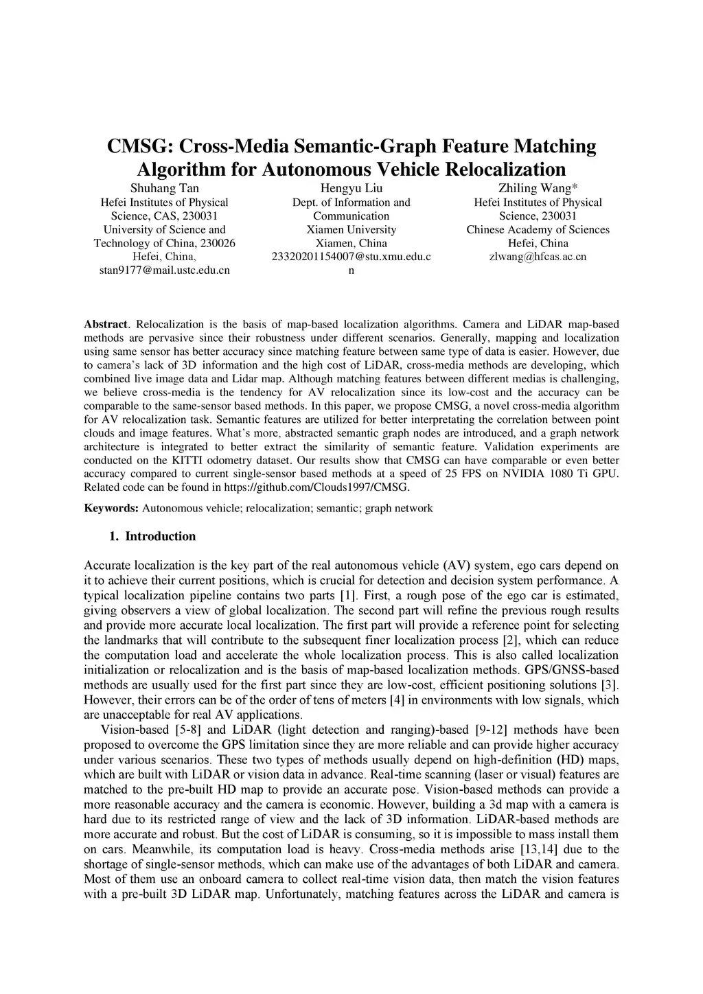Relocalization is the basis of map-based localization algorithms. Camera and LiDAR map-based methods are pervasive since their robustness under different scenarios. Generally, mapping and localization using the same sensor have better accuracy since matching features between the same type of data is easier. However, due to the camera's lack of 3D information and the high cost of LiDAR, cross-media methods are developing, which combined live image data and Lidar map. Although matching features between different media is challenging, we believe cross-media is the tendency for AV relocalization since its low cost and accuracy can be comparable to the same-sensor-based methods. In this paper, we propose CMSG, a novel cross-media algorithm for AV relocalization tasks. Semantic features are utilized for better interpretation the correlation between point clouds and image features. What's more, abstracted semantic graph nodes are introduced, and a graph network architecture is integrated to better extract the similarity of semantic features. Validation experiments are conducted on the KITTI odometry dataset. Our results show that CMSG can have comparable or even better accuracy compared to current single-sensor-based methods at a speed of 25 FPS on NVIDIA 1080 Ti GPU.