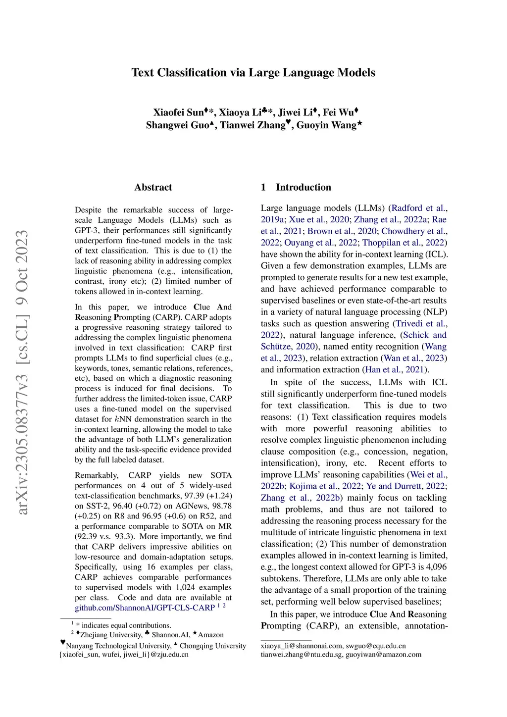 Despite the remarkable success of large-scale Language Models (LLMs) such as GPT-3, their performances still significantly underperform fine-tuned models in the task of text classification. This is due to (1) the lack of reasoning ability in addressing complex linguistic phenomena (e.g., intensification, contrast, irony etc); (2) limited number of tokens allowed in in-context learning. In this paper, we introduce Clue And Reasoning Prompting (CARP). CARP adopts a progressive reasoning strategy tailored to addressing the complex linguistic phenomena involved in text classification: CARP first prompts LLMs to find superficial clues (e.g., keywords, tones, semantic relations, references, etc), based on which a diagnostic reasoning process is induced for final decisions. To further address the limited-token issue, CARP uses a fine-tuned model on the supervised dataset for NN demonstration search in the in-context learning, allowing the model to take the advantage of both LLM's generalization ability and the task-specific evidence provided by the full labeled dataset. Remarkably, CARP yields new SOTA performances on 4 out of 5 widely-used text-classification benchmarks, 97.39 (+1.24) on SST-2, 96.40 (+0.72) on AGNews, 98.78 (+0.25) on R8 and 96.95 (+0.6) on R52, and a performance comparable to SOTA on MR (92.39 v.s. 93.3). More importantly, we find that CARP delivers impressive abilities on low-resource and domain-adaptation setups. Specifically, using 16 examples per class, CARP achieves comparable performances to supervised models with 1,024 examples per class.