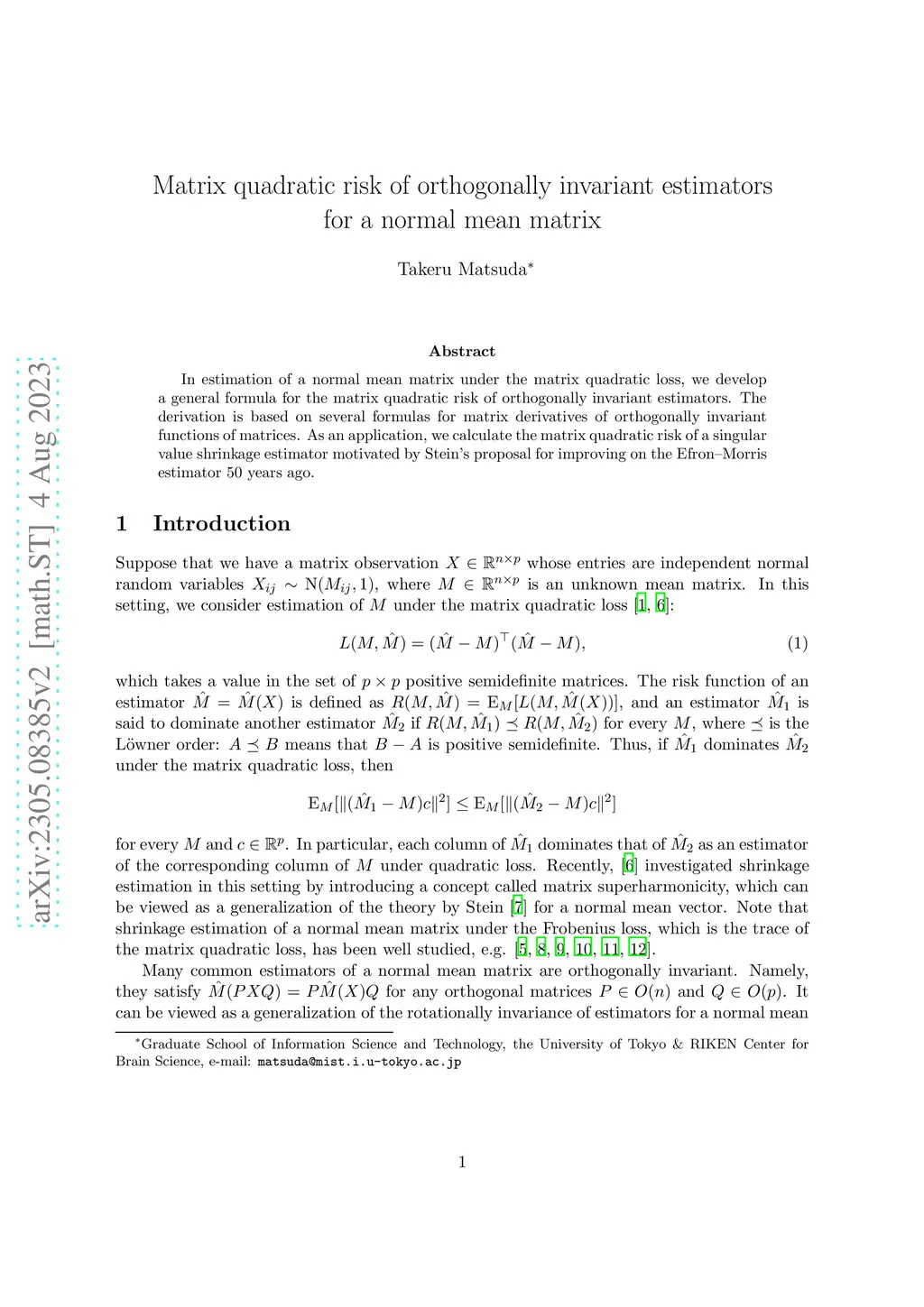 In estimation of a normal mean matrix under the matrix quadratic loss, we develop a general formula for the matrix quadratic risk of orthogonally invariant estimators. The derivation is based on several formulas for matrix derivatives of orthogonally invariant functions of matrices. As an application, we calculate the matrix quadratic risk of a singular value shrinkage estimator motivated by Stein's proposal for improving on the Efron--Morris estimator 50 years ago.
