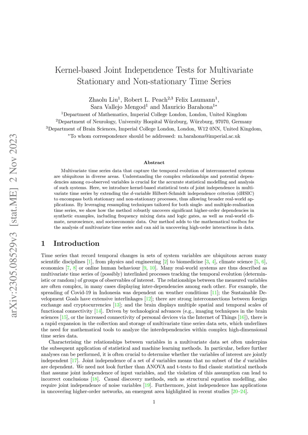 Multivariate time series data that capture the temporal evolution of interconnected systems are ubiquitous in diverse areas. Understanding the complex relationships and potential dependencies among co-observed variables is crucial for the accurate statistical modelling and analysis of such systems. Here, we introduce kernel-based statistical tests of joint independence in multivariate time series by extending the -variable Hilbert-Schmidt independence criterion (dHSIC) to encompass both stationary and non-stationary processes, thus allowing broader real-world applications. By leveraging resampling techniques tailored for both single- and multiple-realisation time series, we show how the method robustly uncovers significant higher-order dependencies in synthetic examples, including frequency mixing data and logic gates, as well as real-world climate, neuroscience, and socioeconomic data. Our method adds to the mathematical toolbox for the analysis of multivariate time series and can aid in uncovering high-order interactions in data.