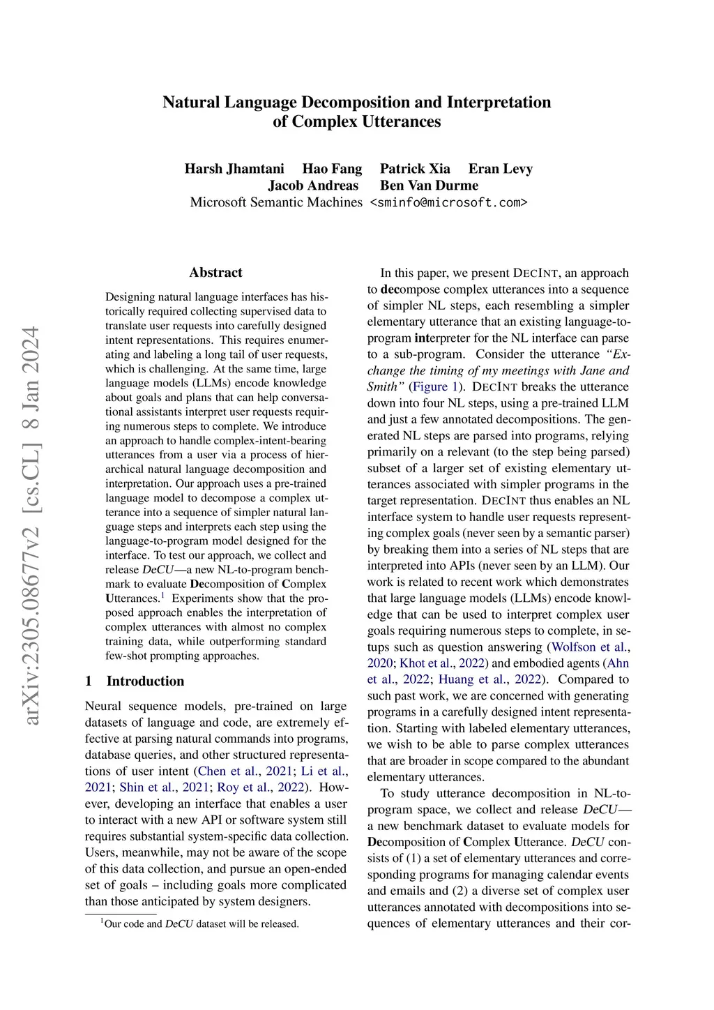 Designing natural language interfaces has historically required collecting supervised data to translate user requests into carefully designed intent representations. This requires enumerating and labeling a long tail of user requests, which is challenging. At the same time, large language models (LLMs) encode knowledge about goals and plans that can help conversational assistants interpret user requests requiring numerous steps to complete. We introduce an approach to handle complex-intent-bearing utterances from a user via a process of hierarchical natural language decomposition and interpretation. Our approach uses a pre-trained language model to decompose a complex utterance into a sequence of simpler natural language steps and interprets each step using the language-to-program model designed for the interface. To test our approach, we collect and release DeCU -- a new NL-to-program benchmark to evaluate Decomposition of Complex Utterances. Experiments show that the proposed approach enables the interpretation of complex utterances with almost no complex training data, while outperforming standard few-shot prompting approaches.