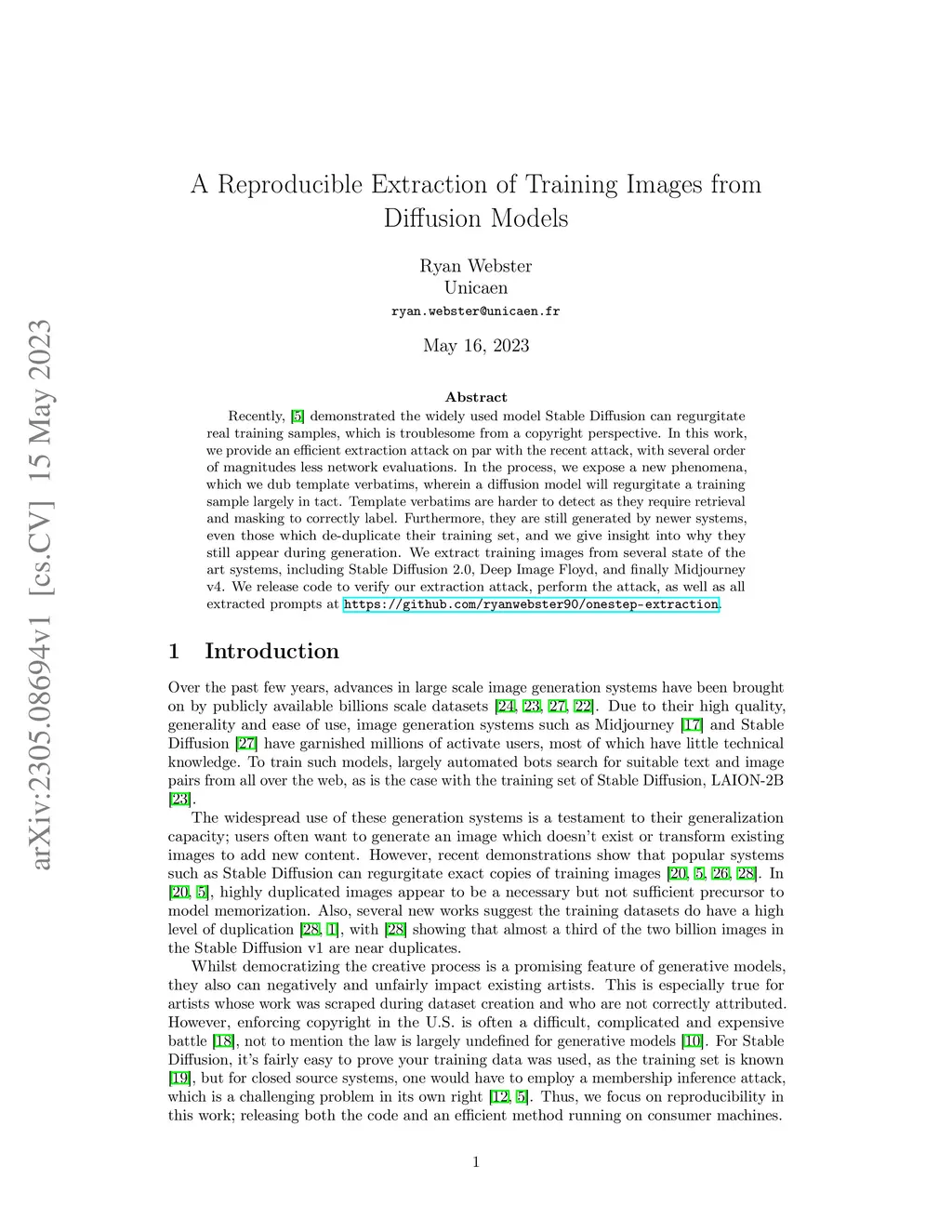 Recently, Carlini et al. demonstrated the widely used model Stable Diffusion can regurgitate real training samples, which is troublesome from a copyright perspective. In this work, we provide an efficient extraction attack on par with the recent attack, with several order of magnitudes less network evaluations. In the process, we expose a new phenomena, which we dub template verbatims, wherein a diffusion model will regurgitate a training sample largely in tact. Template verbatims are harder to detect as they require retrieval and masking to correctly label. Furthermore, they are still generated by newer systems, even those which de-duplicate their training set, and we give insight into why they still appear during generation. We extract training images from several state of the art systems, including Stable Diffusion 2.0, Deep Image Floyd, and finally Midjourney v4. We release code to verify our extraction attack, perform the attack, as well as all extracted prompts at \url{https://github.com/ryanwebster90/onestep-extraction}.