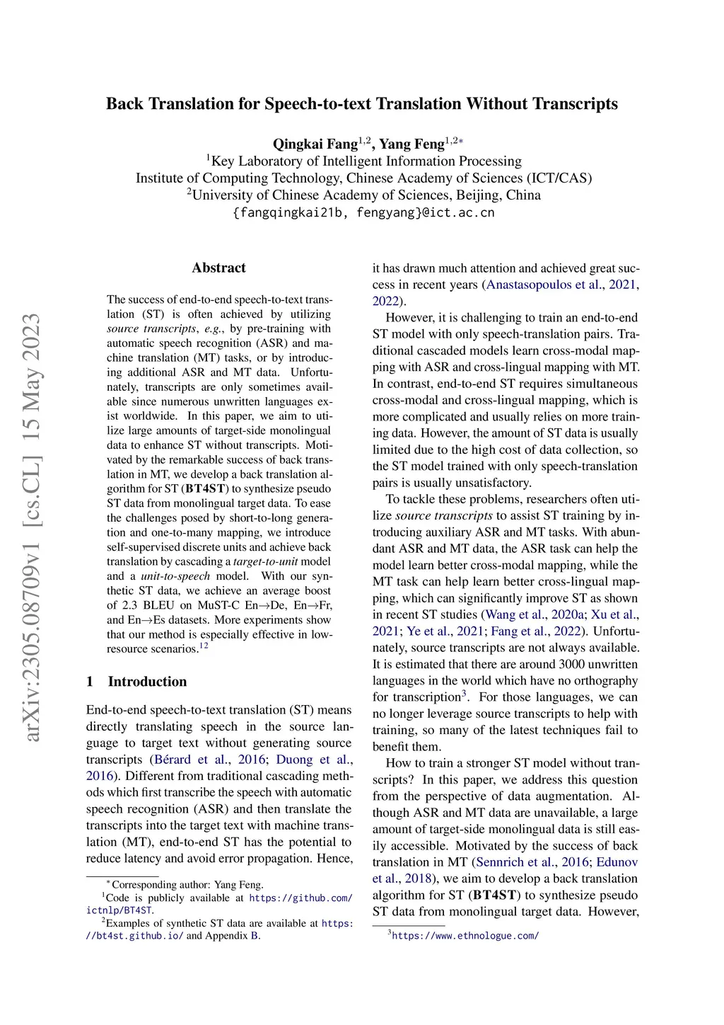 The success of end-to-end speech-to-text translation (ST) is often achieved by utilizing source transcripts, e.g., by pre-training with automatic speech recognition (ASR) and machine translation (MT) tasks, or by introducing additional ASR and MT data. Unfortunately, transcripts are only sometimes available since numerous unwritten languages exist worldwide. In this paper, we aim to utilize large amounts of target-side monolingual data to enhance ST without transcripts. Motivated by the remarkable success of back translation in MT, we develop a back translation algorithm for ST (BT4ST) to synthesize pseudo ST data from monolingual target data. To ease the challenges posed by short-to-long generation and one-to-many mapping, we introduce self-supervised discrete units and achieve back translation by cascading a target-to-unit model and a unit-to-speech model. With our synthetic ST data, we achieve an average boost of 2.3 BLEU on MuST-C En-De, En-Fr, and En-Es datasets. More experiments show that our method is especially effective in low-resource scenarios.