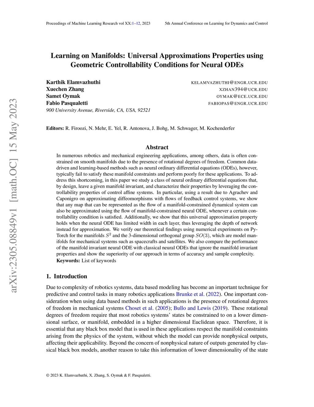 In numerous robotics and mechanical engineering applications, among others, data is often constrained on smooth manifolds due to the presence of rotational degrees of freedom. Common datadriven and learning-based methods such as neural ordinary differential equations (ODEs), however, typically fail to satisfy these manifold constraints and perform poorly for these applications. To address this shortcoming, in this paper we study a class of neural ordinary differential equations that, by design, leave a given manifold invariant, and characterize their properties by leveraging the controllability properties of control affine systems. In particular, using a result due to Agrachev and Caponigro on approximating diffeomorphisms with flows of feedback control systems, we show that any map that can be represented as the flow of a manifold-constrained dynamical system can also be approximated using the flow of manifold-constrained neural ODE, whenever a certain controllability condition is satisfied. Additionally, we show that this universal approximation property holds when the neural ODE has limited width in each layer, thus leveraging the depth of network instead for approximation. We verify our theoretical findings using numerical experiments on PyTorch for the manifolds S2 and the 3-dimensional orthogonal group SO(3), which are model manifolds for mechanical systems such as spacecrafts and satellites. We also compare the performance of the manifold invariant neural ODE with classical neural ODEs that ignore the manifold invariant properties and show the superiority of our approach in terms of accuracy and sample complexity.