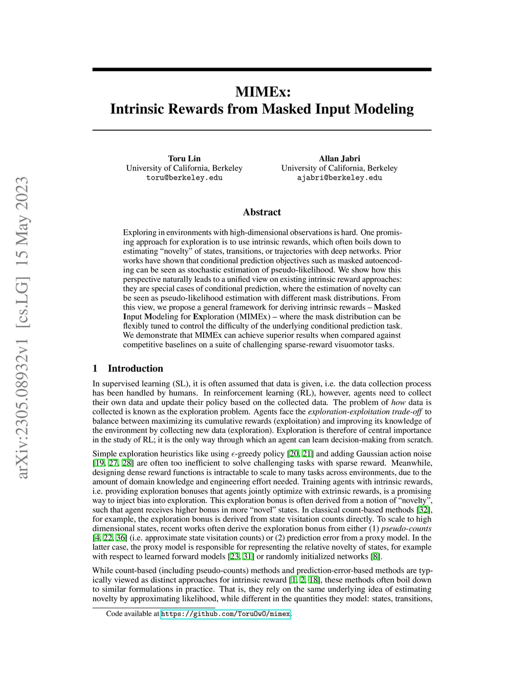 MIMEx: Intrinsic Rewards from Masked Input Modeling