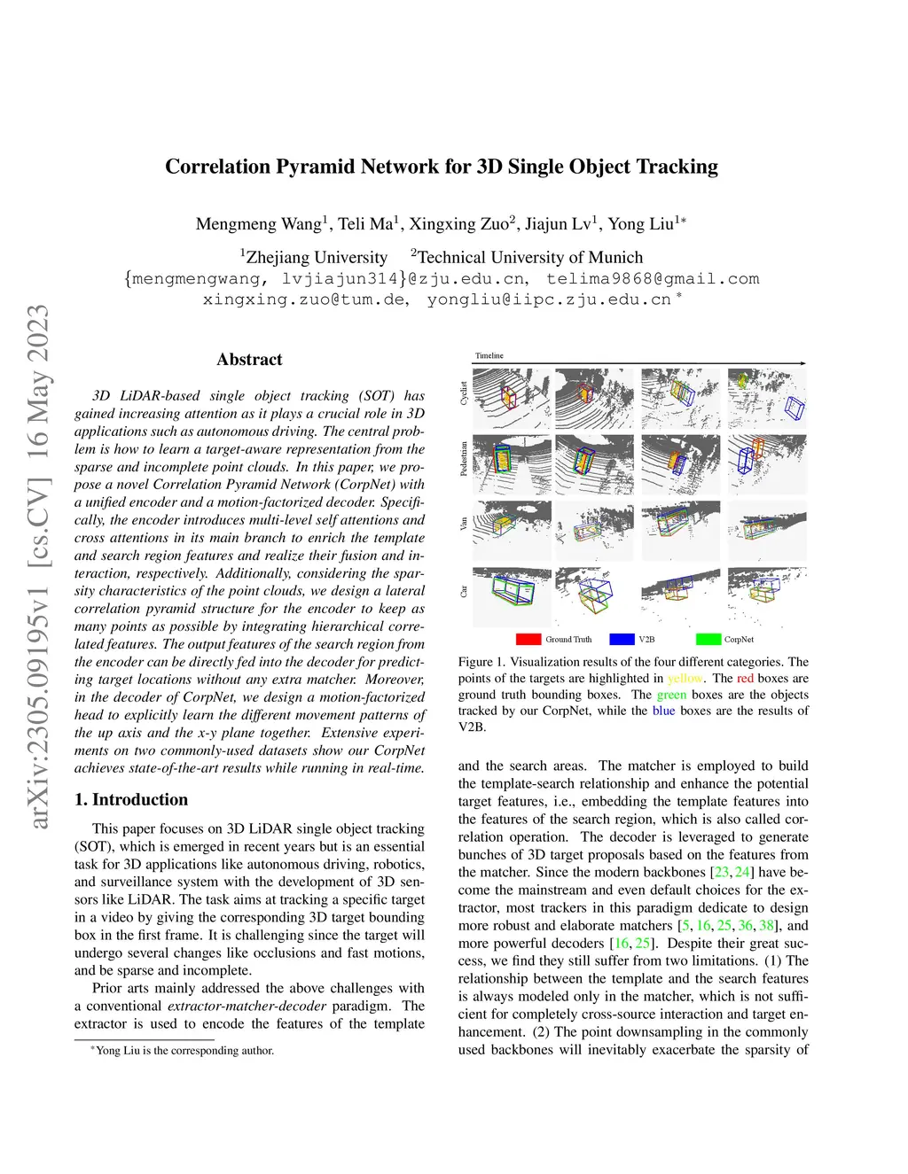 3D LiDAR-based single object tracking (SOT) has gained increasing attention as it plays a crucial role in 3D applications such as autonomous driving. The central problem is how to learn a target-aware representation from the sparse and incomplete point clouds. In this paper, we propose a novel Correlation Pyramid Network (CorpNet) with a unified encoder and a motion-factorized decoder. Specifically, the encoder introduces multi-level self attentions and cross attentions in its main branch to enrich the template and search region features and realize their fusion and interaction, respectively. Additionally, considering the sparsity characteristics of the point clouds, we design a lateral correlation pyramid structure for the encoder to keep as many points as possible by integrating hierarchical correlated features. The output features of the search region from the encoder can be directly fed into the decoder for predicting target locations without any extra matcher. Moreover, in the decoder of CorpNet, we design a motion-factorized head to explicitly learn the different movement patterns of the up axis and the x-y plane together. Extensive experiments on two commonly-used datasets show our CorpNet achieves state-of-the-art results while running in real-time.
