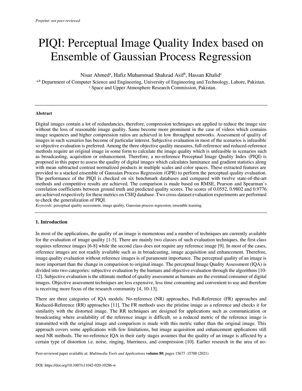 Digital images contain a lot of redundancies, therefore, compression techniques are applied to reduce the image size without loss of reasonable image quality. Same become more prominent in the case of videos which contains image sequences and higher compression ratios are achieved in low throughput networks. Assessment of quality of images in such scenarios has become of particular interest. Subjective evaluation in most of the scenarios is infeasible so objective evaluation is preferred. Among the three objective quality measures, full-reference and reduced-reference methods require an original image in some form to calculate the image quality which is unfeasible in scenarios such as broadcasting, acquisition or enhancement. Therefore, a no-reference Perceptual Image Quality Index (PIQI) is proposed in this paper to assess the quality of digital images which calculates luminance and gradient statistics along with mean subtracted contrast normalized products in multiple scales and color spaces. These extracted features are provided to a stacked ensemble of Gaussian Process Regression (GPR) to perform the perceptual quality evaluation. The performance of the PIQI is checked on six benchmark databases and compared with twelve state-of-the-art methods and competitive results are achieved. The comparison is made based on RMSE, Pearson and Spearman correlation coefficients between ground truth and predicted quality scores. The scores of 0.0552, 0.9802 and 0.9776 are achieved respectively for these metrics on CSIQ database. Two cross-dataset evaluation experiments are performed to check the generalization of PIQI.