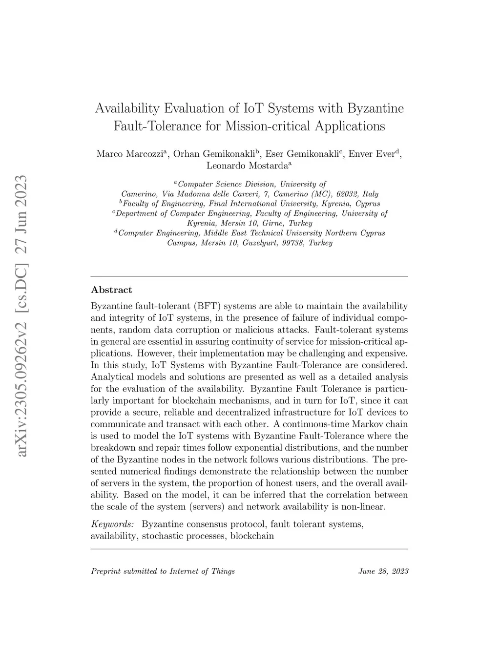 Byzantine fault-tolerant (BFT) systems are able to maintain the availability and integrity of IoT systems, in presence of failure of individual components, random data corruption or malicious attacks. Fault-tolerant systems in general are essential in assuring continuity of service for mission critical applications. However, their implementation may be challenging and expensive. In this study, IoT Systems with Byzantine Fault-Tolerance are considered. Analytical models and solutions are presented as well as a detailed analysis for the evaluation of the availability. Byzantine Fault Tolerance is particularly important for blockchain mechanisms, and in turn for IoT, since it can provide a secure, reliable and decentralized infrastructure for IoT devices to communicate and transact with each other. The proposed model is based on continuous-time Markov chains, and it analyses the availability of Byzantine Fault-Tolerant systems. While the availability model is based on a continuous-time Markov chain where the breakdown and repair times follow exponential distributions, the number of the Byzantine nodes in the network studied follows various distributions. The numerical results presented report availability as a function of the number of participants and the relative number of honest actors in the system. It can be concluded from the model that there is a non-linear relationship between the number of servers and network availability; i.e. the availability is inversely proportional to the number of nodes in the system. This relationship is further strengthened as the ratio of break-down rate over repair rate increases.