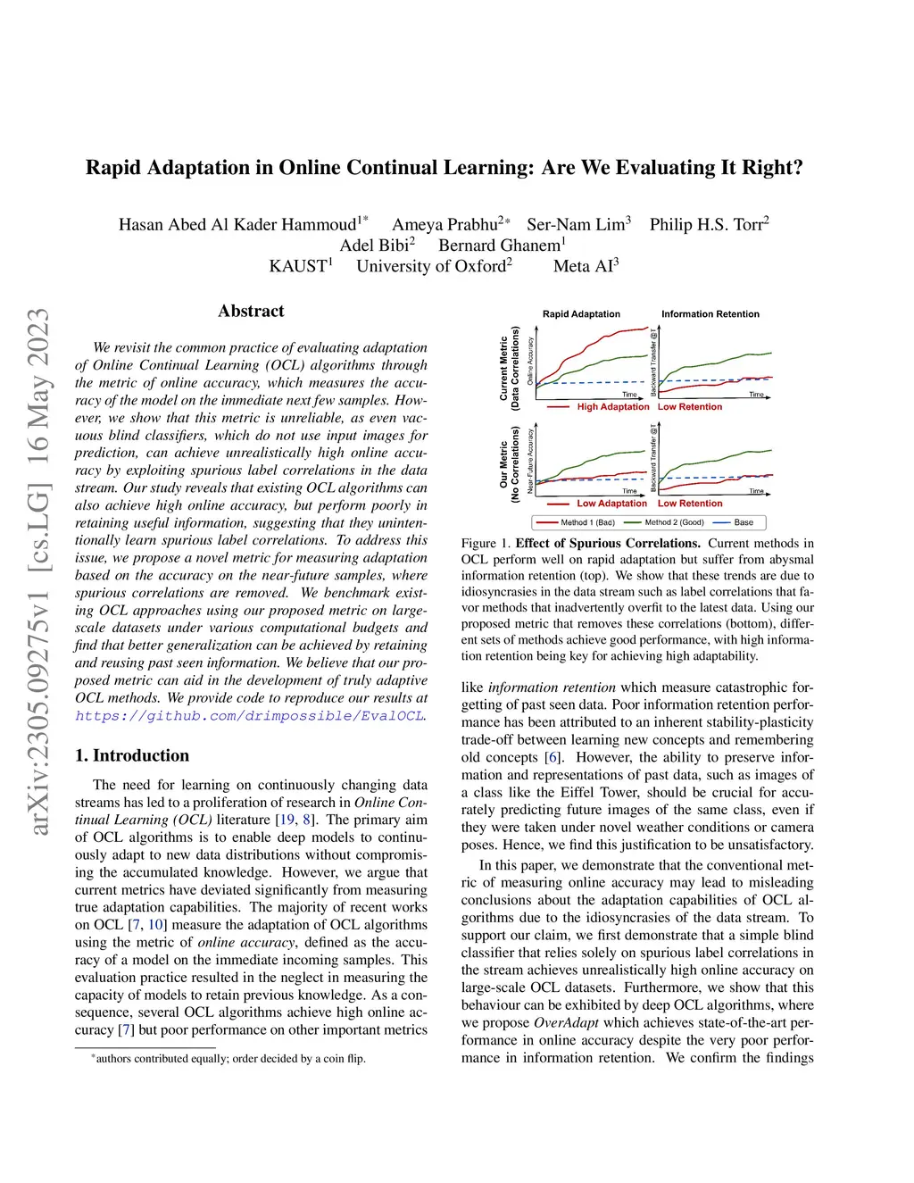 We revisit the common practice of evaluating adaptation of Online Continual Learning (OCL) algorithms through the metric of online accuracy, which measures the accuracy of the model on the immediate next few samples. However, we show that this metric is unreliable, as even vacuous blind classifiers, which do not use input images for prediction, can achieve unrealistically high online accuracy by exploiting spurious label correlations in the data stream. Our study reveals that existing OCL algorithms can also achieve high online accuracy, but perform poorly in retaining useful information, suggesting that they unintentionally learn spurious label correlations. To address this issue, we propose a novel metric for measuring adaptation based on the accuracy on the near-future samples, where spurious correlations are removed. We benchmark existing OCL approaches using our proposed metric on large-scale datasets under various computational budgets and find that better generalization can be achieved by retaining and reusing past seen information. We believe that our proposed metric can aid in the development of truly adaptive OCL methods. We provide code to reproduce our results at https://github.com/drimpossible/EvalOCL.