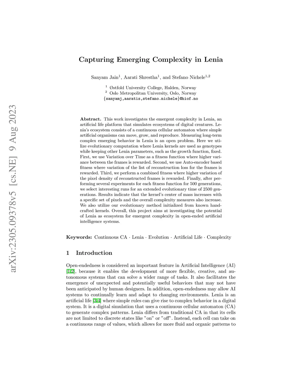 This research project investigates Lenia, an artificial life platform that simulates ecosystems of digital creatures. Lenia's ecosystem consists of simple, artificial organisms that can move, consume, grow, and reproduce. The platform is important as a tool for studying artificial life and evolution, as it provides a scalable and flexible environment for creating a diverse range of organisms with varying abilities and behaviors. Measuring complexity in Lenia is a key aspect of the study, which identifies the metrics for measuring long-term complex emerging behavior of rules, with the aim of evolving better Lenia behaviors which are yet not discovered. The Genetic Algorithm uses neighborhoods or kernels as genotype while keeping the rest of the parameters of Lenia as fixed, for example growth function, to produce different behaviors respective to the population and then measures fitness value to decide the complexity of the resulting behavior. First, we use Variation over Time as a fitness function where higher variance between the frames are rewarded. Second, we use Auto-encoder based fitness where variation of the list of reconstruction loss for the frames is rewarded. Third, we perform combined fitness where higher variation of the pixel density of reconstructed frames is rewarded. All three experiments are tweaked with pixel alive threshold and frames used. Finally, after performing nine experiments of each fitness for 500 generations, we pick configurations from all experiments such that there is a scope of further evolution, and run it for 2500 generations. Results show that the kernel's center of mass increases with a specific set of pixels and together with borders the kernel try to achieve a Gaussian distribution. Results are available at https://s4nyam.github.io/evolenia/