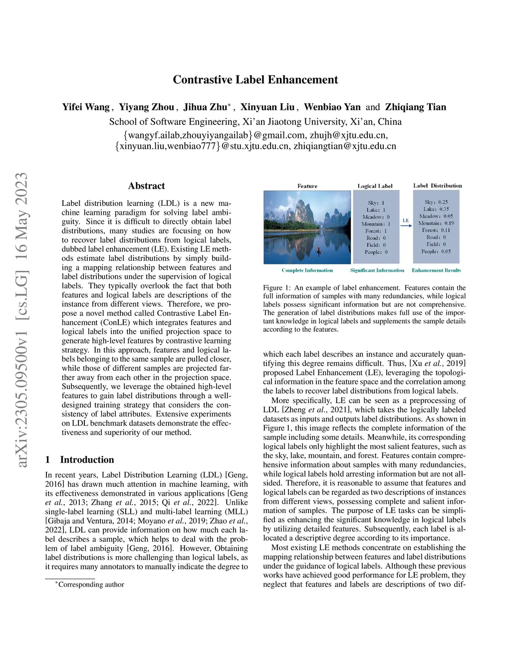 Label distribution learning (LDL) is a new machine learning paradigm for solving label ambiguity. Since it is difficult to directly obtain label distributions, many studies are focusing on how to recover label distributions from logical labels, dubbed label enhancement (LE). Existing LE methods estimate label distributions by simply building a mapping relationship between features and label distributions under the supervision of logical labels. They typically overlook the fact that both features and logical labels are descriptions of the instance from different views. Therefore, we propose a novel method called Contrastive Label Enhancement (ConLE) which integrates features and logical labels into the unified projection space to generate high-level features by contrastive learning strategy. In this approach, features and logical labels belonging to the same sample are pulled closer, while those of different samples are projected farther away from each other in the projection space. Subsequently, we leverage the obtained high-level features to gain label distributions through a welldesigned training strategy that considers the consistency of label attributes. Extensive experiments on LDL benchmark datasets demonstrate the effectiveness and superiority of our method.