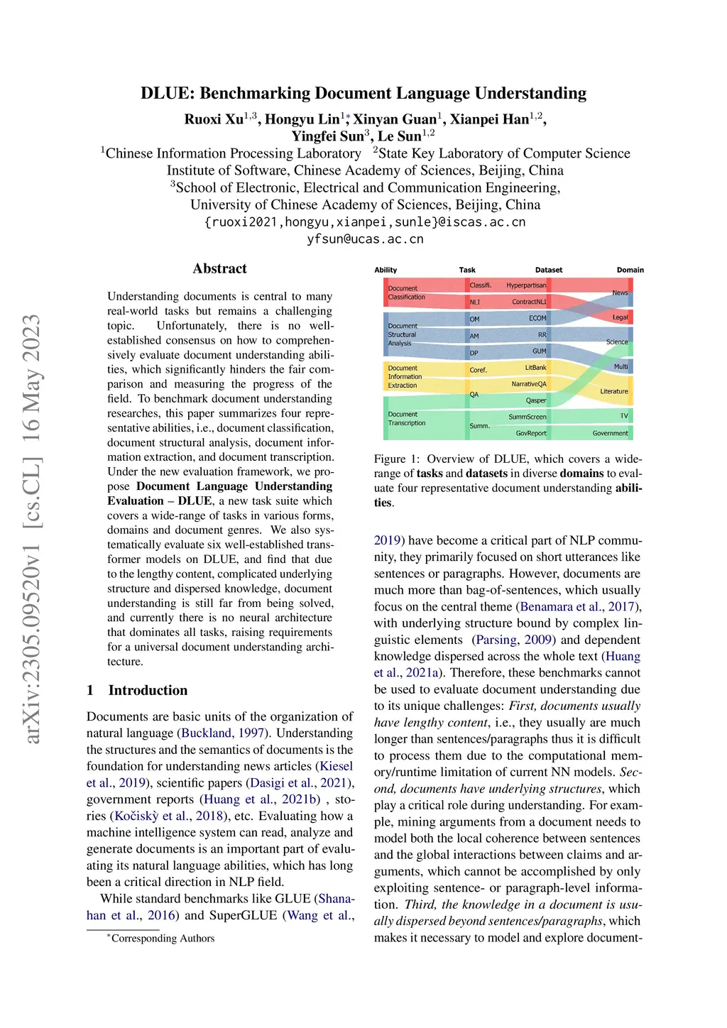 Understanding documents is central to many real-world tasks but remains a challenging topic. Unfortunately, there is no well-established consensus on how to comprehensively evaluate document understanding abilities, which significantly hinders the fair comparison and measuring the progress of the field. To benchmark document understanding researches, this paper summarizes four representative abilities, i.e., document classification, document structural analysis, document information extraction, and document transcription. Under the new evaluation framework, we propose \textbf{Document Language Understanding Evaluation} -- \textbf{DLUE}, a new task suite which covers a wide-range of tasks in various forms, domains and document genres. We also systematically evaluate six well-established transformer models on DLUE, and find that due to the lengthy content, complicated underlying structure and dispersed knowledge, document understanding is still far from being solved, and currently there is no neural architecture that dominates all tasks, raising requirements for a universal document understanding architecture.