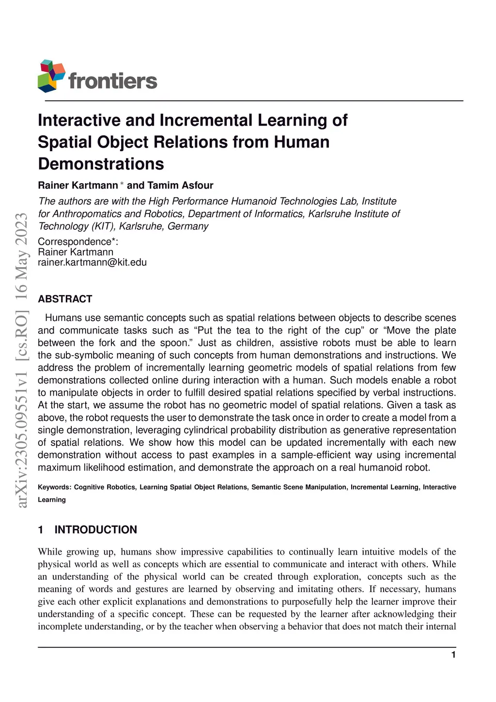Humans use semantic concepts such as spatial relations between objects to describe scenes and communicate tasks such as "Put the tea to the right of the cup" or "Move the plate between the fork and the spoon." Just as children, assistive robots must be able to learn the sub-symbolic meaning of such concepts from human demonstrations and instructions. We address the problem of incrementally learning geometric models of spatial relations from few demonstrations collected online during interaction with a human. Such models enable a robot to manipulate objects in order to fulfill desired spatial relations specified by verbal instructions. At the start, we assume the robot has no geometric model of spatial relations. Given a task as above, the robot requests the user to demonstrate the task once in order to create a model from a single demonstration, leveraging cylindrical probability distribution as generative representation of spatial relations. We show how this model can be updated incrementally with each new demonstration without access to past examples in a sample-efficient way using incremental maximum likelihood estimation, and demonstrate the approach on a real humanoid robot.