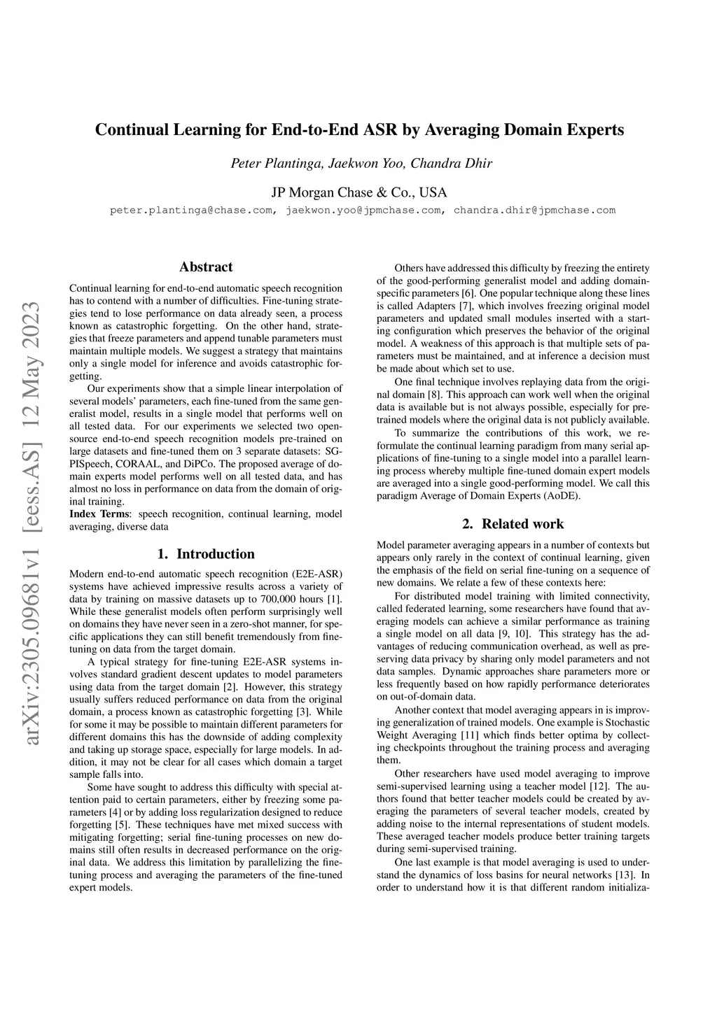 Continual learning for end-to-end automatic speech recognition has to contend with a number of difficulties. Fine-tuning strategies tend to lose performance on data already seen, a process known as catastrophic forgetting. On the other hand, strategies that freeze parameters and append tunable parameters must maintain multiple models. We suggest a strategy that maintains only a single model for inference and avoids catastrophic forgetting. Our experiments show that a simple linear interpolation of several models' parameters, each fine-tuned from the same generalist model, results in a single model that performs well on all tested data. For our experiments we selected two open-source end-to-end speech recognition models pre-trained on large datasets and fine-tuned them on 3 separate datasets: SGPISpeech, CORAAL, and DiPCo. The proposed average of domain experts model performs well on all tested data, and has almost no loss in performance on data from the domain of original training.