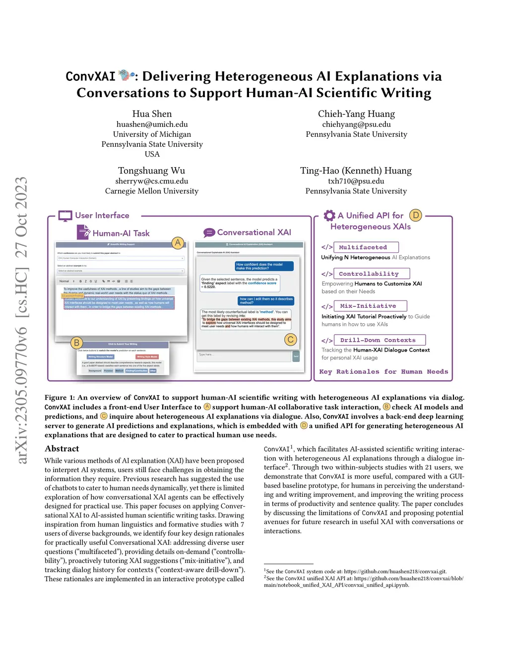 Despite a surge collection of XAI methods, users still struggle to obtain required AI explanations. Previous research suggests chatbots as dynamic solutions, but the effective design of conversational XAI agents for practical human needs remains under-explored. This paper focuses on Conversational XAI for AI-assisted scientific writing tasks. Drawing from human linguistic theories and formative studies, we identify four design rationales: "multifaceted", "controllability", "mix-initiative", "context-aware drill-down". We incorporate them into an interactive prototype, ConvXAI, which facilitates heterogeneous AI explanations for scientific writing through dialogue. In two studies with 21 users, ConvXAI outperforms a GUI-based baseline on improving human-perceived understanding and writing improvement. The paper further discusses the practical human usage patterns in interacting with ConvXAI for scientific co-writing.