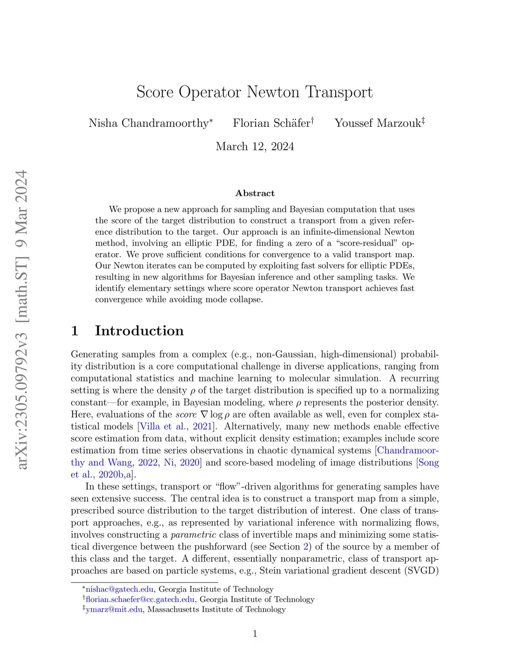 We propose a new approach for sampling and Bayesian computation that uses the score of the target distribution to construct a transport from a given reference distribution to the target. Our approach is an infinite-dimensional Newton method, involving a linear PDE, for finding a zero of a ``score-residual'' operator. We prove sufficient conditions for convergence to a valid transport map. Our Newton iterates can be computed by exploiting fast solvers for elliptic PDEs, resulting in new algorithms for Bayesian inference and other sampling tasks. We identify elementary settings where score-operator Newton transport achieves fast convergence while avoiding mode collapse.