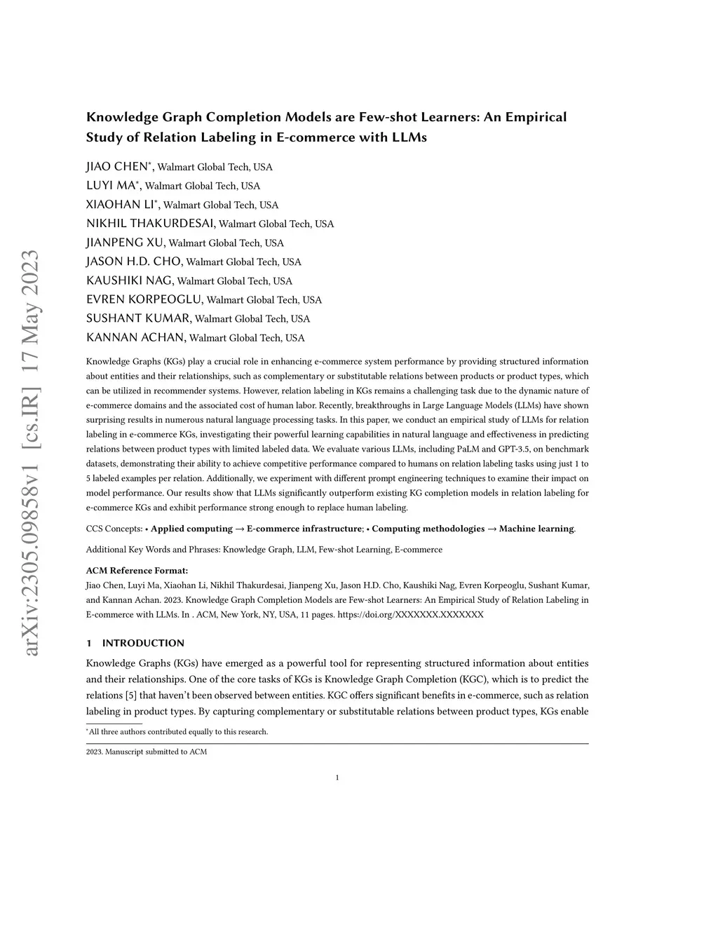 Knowledge Graphs (KGs) play a crucial role in enhancing e-commerce system performance by providing structured information about entities and their relationships, such as complementary or substitutable relations between products or product types, which can be utilized in recommender systems. However, relation labeling in KGs remains a challenging task due to the dynamic nature of e-commerce domains and the associated cost of human labor. Recently, breakthroughs in Large Language Models (LLMs) have shown surprising results in numerous natural language processing tasks. In this paper, we conduct an empirical study of LLMs for relation labeling in e-commerce KGs, investigating their powerful learning capabilities in natural language and effectiveness in predicting relations between product types with limited labeled data. We evaluate various LLMs, including PaLM and GPT-3.5, on benchmark datasets, demonstrating their ability to achieve competitive performance compared to humans on relation labeling tasks using just 1 to 5 labeled examples per relation. Additionally, we experiment with different prompt engineering techniques to examine their impact on model performance. Our results show that LLMs significantly outperform existing KG completion models in relation labeling for e-commerce KGs and exhibit performance strong enough to replace human labeling.