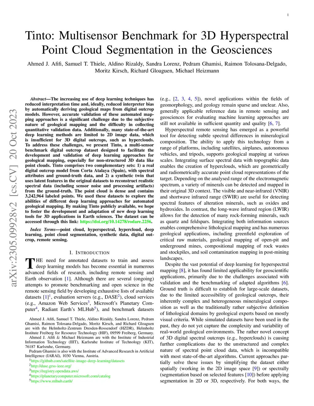 The increasing use of deep learning techniques has reduced interpretation time and, ideally, reduced interpreter bias by automatically deriving geological maps from digital outcrop models. However, accurate validation of these automated mapping approaches is a significant challenge due to the subjective nature of geological mapping and the difficulty in collecting quantitative validation data. Additionally, many state-of-the-art deep learning methods are limited to 2D image data, which is insufficient for 3D digital outcrops, such as hyperclouds. To address these challenges, we present Tinto, a multi-sensor benchmark digital outcrop dataset designed to facilitate the development and validation of deep learning approaches for geological mapping, especially for non-structured 3D data like point clouds. Tinto comprises two complementary sets: 1) a real digital outcrop model from Corta Atalaya (Spain), with spectral attributes and ground-truth data, and 2) a synthetic twin that uses latent features in the original datasets to reconstruct realistic spectral data (including sensor noise and processing artifacts) from the ground-truth. The point cloud is dense and contains 3,242,964 labeled points. We used these datasets to explore the abilities of different deep learning approaches for automated geological mapping. By making Tinto publicly available, we hope to foster the development and adaptation of new deep learning tools for 3D applications in Earth sciences. The dataset can be accessed through this link: https://doi.org/10.14278/rodare.2256.