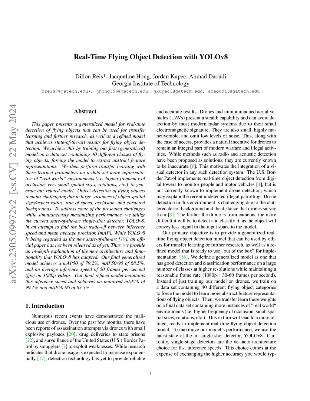 This paper presents a generalized model for real-time detection of flying objects that can be used for transfer learning and further research, as well as a refined model that achieves state-of-the-art results for flying object detection. We achieve this by training our first (generalized) model on a data set containing 40 different classes of flying objects, forcing the model to extract abstract feature representations. We then perform transfer learning with these learned parameters on a data set more representative of real world environments (i.e. higher frequency of occlusion, very small spatial sizes, rotations, etc.) to generate our refined model. Object detection of flying objects remains challenging due to large variances of object spatial sizes/aspect ratios, rate of speed, occlusion, and clustered backgrounds. To address some of the presented challenges while simultaneously maximizing performance, we utilize the current state-of-the-art single-shot detector, YOLOv8, in an attempt to find the best trade-off between inference speed and mean average precision (mAP). While YOLOv8 is being regarded as the new state-of-the-art, an official paper has not been released as of yet. Thus, we provide an in-depth explanation of the new architecture and functionality that YOLOv8 has adapted. Our final generalized model achieves a mAP50 of 79.2%, mAP50-95 of 68.5%, and an average inference speed of 50 frames per second (fps) on 1080p videos. Our final refined model maintains this inference speed and achieves an improved mAP50 of 99.1% and mAP50-95 of 83.5%