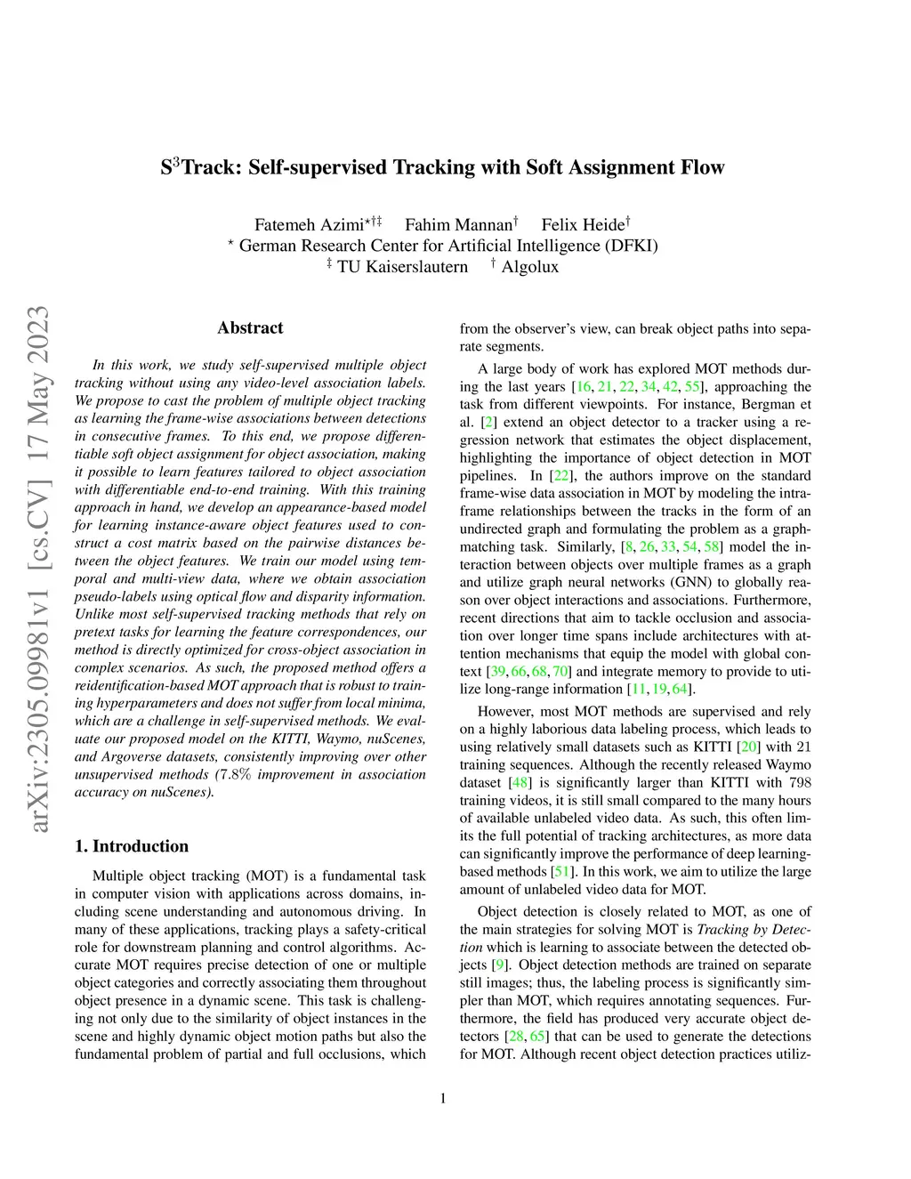 In this work, we study self-supervised multiple object tracking without using any video-level association labels. We propose to cast the problem of multiple object tracking as learning the frame-wise associations between detections in consecutive frames. To this end, we propose differentiable soft object assignment for object association, making it possible to learn features tailored to object association with differentiable end-to-end training. With this training approach in hand, we develop an appearance-based model for learning instance-aware object features used to construct a cost matrix based on the pairwise distances between the object features. We train our model using temporal and multi-view data, where we obtain association pseudo-labels using optical flow and disparity information. Unlike most self-supervised tracking methods that rely on pretext tasks for learning the feature correspondences, our method is directly optimized for cross-object association in complex scenarios. As such, the proposed method offers a reidentification-based MOT approach that is robust to training hyperparameters and does not suffer from local minima, which are a challenge in self-supervised methods. We evaluate our proposed model on the KITTI, Waymo, nuScenes, and Argoverse datasets, consistently improving over other unsupervised methods ( improvement in association accuracy on nuScenes).
