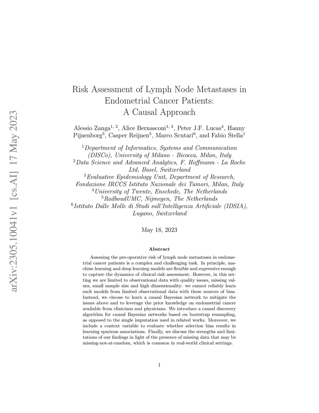 Assessing the pre-operative risk of lymph node metastases in endometrial cancer patients is a complex and challenging task. In principle, machine learning and deep learning models are flexible and expressive enough to capture the dynamics of clinical risk assessment. However, in this setting we are limited to observational data with quality issues, missing values, small sample size and high dimensionality: we cannot reliably learn such models from limited observational data with these sources of bias. Instead, we choose to learn a causal Bayesian network to mitigate the issues above and to leverage the prior knowledge on endometrial cancer available from clinicians and physicians. We introduce a causal discovery algorithm for causal Bayesian networks based on bootstrap resampling, as opposed to the single imputation used in related works. Moreover, we include a context variable to evaluate whether selection bias results in learning spurious associations. Finally, we discuss the strengths and limitations of our findings in light of the presence of missing data that may be missing-not-at-random, which is common in real-world clinical settings.