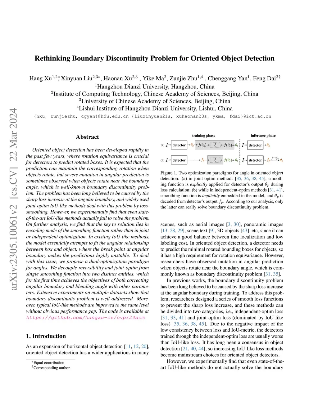 Oriented object detection has been developed rapidly in the past few years, where rotation equivariance is crucial for detectors to predict rotated boxes. It is expected that the prediction can maintain the corresponding rotation when objects rotate, but severe mutation in angular prediction is sometimes observed when objects rotate near the boundary angle, which is well-known boundary discontinuity problem. The problem has been long believed to be caused by the sharp loss increase at the angular boundary, and widely used joint-optim IoU-like methods deal with this problem by loss-smoothing. However, we experimentally find that even state-of-the-art IoU-like methods actually fail to solve the problem. On further analysis, we find that the key to solution lies in encoding mode of the smoothing function rather than in joint or independent optimization. In existing IoU-like methods, the model essentially attempts to fit the angular relationship between box and object, where the break point at angular boundary makes the predictions highly unstable.To deal with this issue, we propose a dual-optimization paradigm for angles. We decouple reversibility and joint-optim from single smoothing function into two distinct entities, which for the first time achieves the objectives of both correcting angular boundary and blending angle with other parameters.Extensive experiments on multiple datasets show that boundary discontinuity problem is well-addressed. Moreover, typical IoU-like methods are improved to the same level without obvious performance gap. The code is available at https://github.com/hangxu-cv/cvpr24acm.