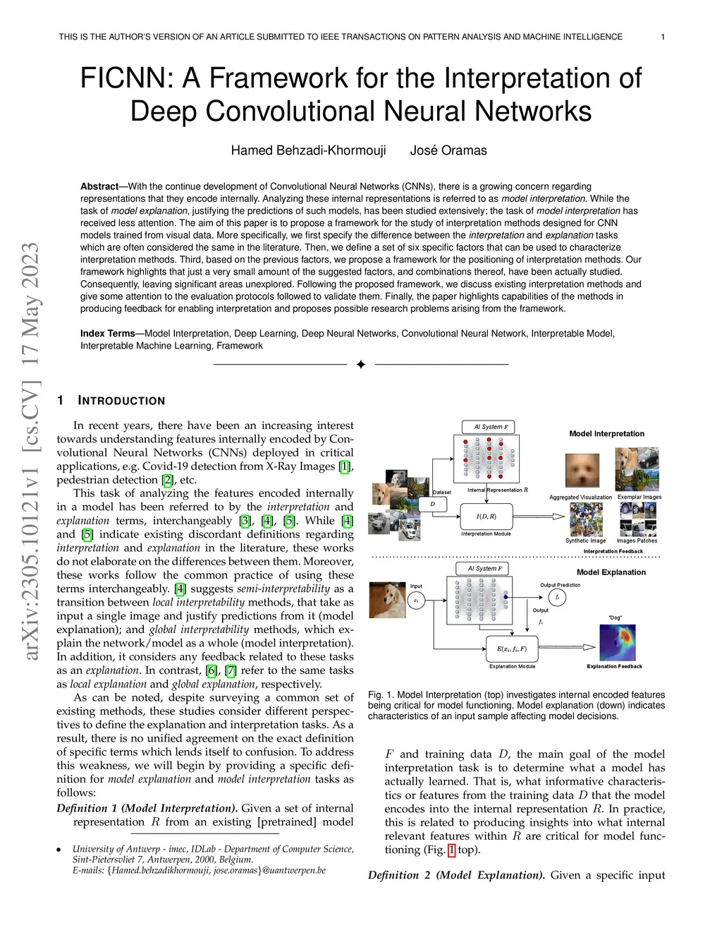 With the continue development of Convolutional Neural Networks (CNNs), there is a growing concern regarding representations that they encode internally. Analyzing these internal representations is referred to as model interpretation. While the task of model explanation, justifying the predictions of such models, has been studied extensively; the task of model interpretation has received less attention. The aim of this paper is to propose a framework for the study of interpretation methods designed for CNN models trained from visual data. More specifically, we first specify the difference between the interpretation and explanation tasks which are often considered the same in the literature. Then, we define a set of six specific factors that can be used to characterize interpretation methods. Third, based on the previous factors, we propose a framework for the positioning of interpretation methods. Our framework highlights that just a very small amount of the suggested factors, and combinations thereof, have been actually studied. Consequently, leaving significant areas unexplored. Following the proposed framework, we discuss existing interpretation methods and give some attention to the evaluation protocols followed to validate them. Finally, the paper highlights capabilities of the methods in producing feedback for enabling interpretation and proposes possible research problems arising from the framework.