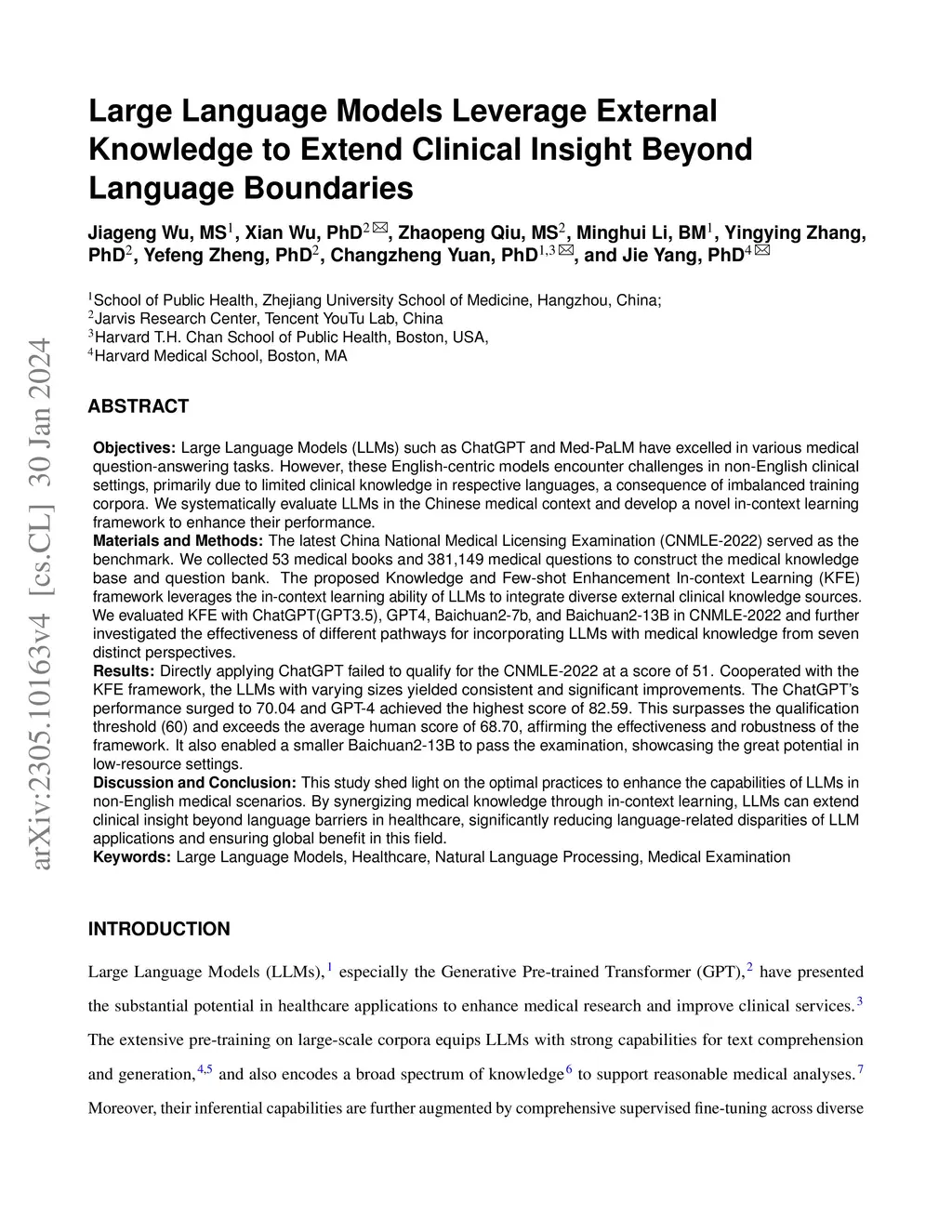 : Large Language Models (LLMs) such as ChatGPT and Med-PaLM have excelled in various medical question-answering tasks. However, these English-centric models encounter challenges in non-English clinical settings, primarily due to limited clinical knowledge in respective languages, a consequence of imbalanced training corpora. We systematically evaluate LLMs in the Chinese medical context and develop a novel in-context learning framework to enhance their performance. : The latest China National Medical Licensing Examination (CNMLE-2022) served as the benchmark. We collected 53 medical books and 381,149 medical questions to construct the medical knowledge base and question bank. The proposed Knowledge and Few-shot Enhancement In-context Learning (KFE) framework leverages the in-context learning ability of LLMs to integrate diverse external clinical knowledge sources. We evaluated KFE with ChatGPT(GPT3.5), GPT4, Baichuan2(BC2)-7B, and BC2-13B in CNMLE-2022 and investigated the effectiveness of different pathways for incorporating LLMs with medical knowledge from 7 perspectives. : Directly applying ChatGPT failed to qualify for the CNMLE-2022 at a score of 51. Cooperated with the KFE, the LLMs with varying sizes yielded consistent and significant improvements. The ChatGPT's performance surged to 70.04 and GPT-4 achieved the highest score of 82.59. This surpasses the qualification threshold (60) and exceeds the average human score of 68.70. It also enabled a smaller BC2-13B to pass the examination, showcasing the great potential in low-resource settings. : By synergizing medical knowledge through in-context learning, LLM can extend clinical insight beyond language barriers, significantly reducing language-related disparities of LLM applications and ensuring global benefit in healthcare.
