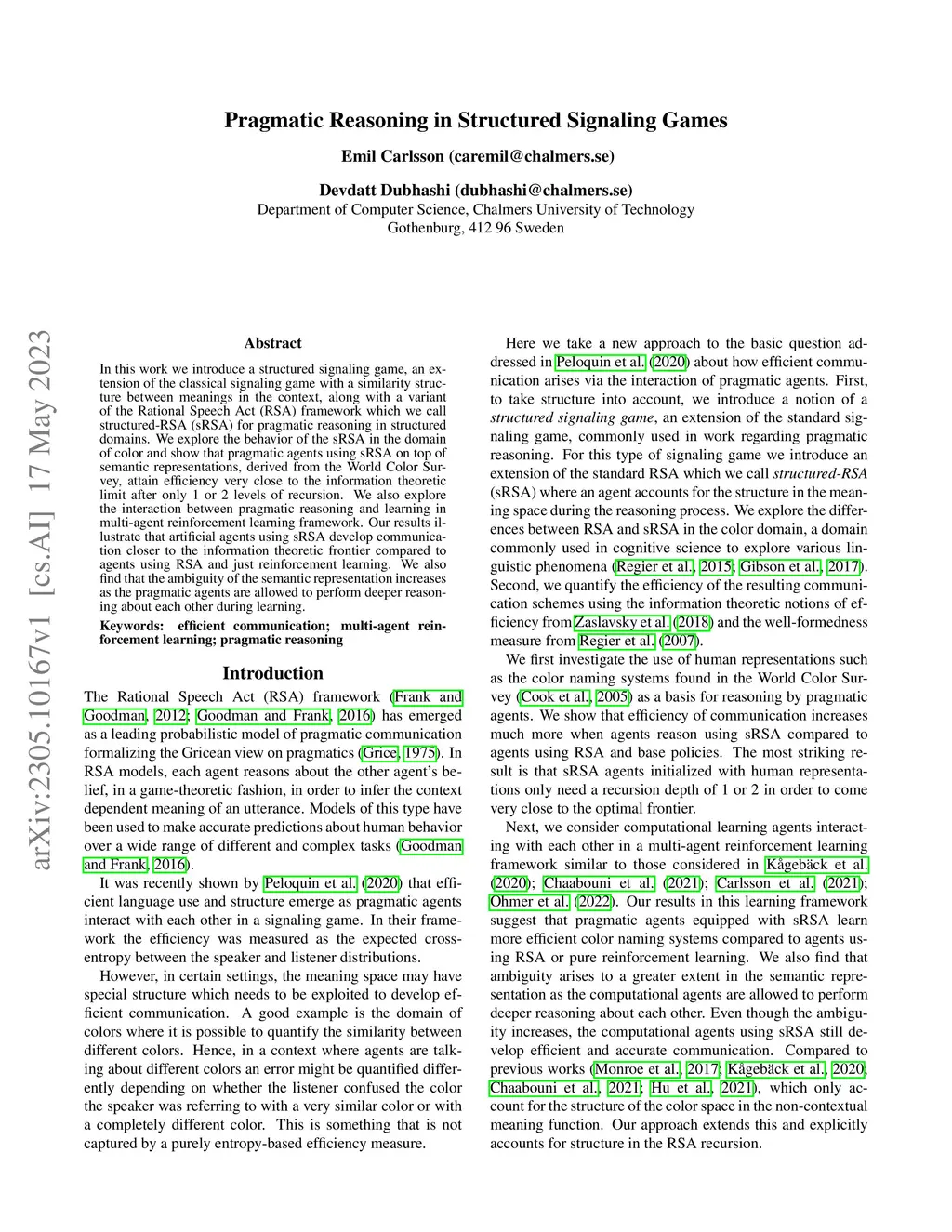 In this work we introduce a structured signaling game, an extension of the classical signaling game with a similarity structure between meanings in the context, along with a variant of the Rational Speech Act (RSA) framework which we call structured-RSA (sRSA) for pragmatic reasoning in structured domains. We explore the behavior of the sRSA in the domain of color and show that pragmatic agents using sRSA on top of semantic representations, derived from the World Color Survey, attain efficiency very close to the information theoretic limit after only 1 or 2 levels of recursion. We also explore the interaction between pragmatic reasoning and learning in multi-agent reinforcement learning framework. Our results illustrate that artificial agents using sRSA develop communication closer to the information theoretic frontier compared to agents using RSA and just reinforcement learning. We also find that the ambiguity of the semantic representation increases as the pragmatic agents are allowed to perform deeper reasoning about each other during learning.