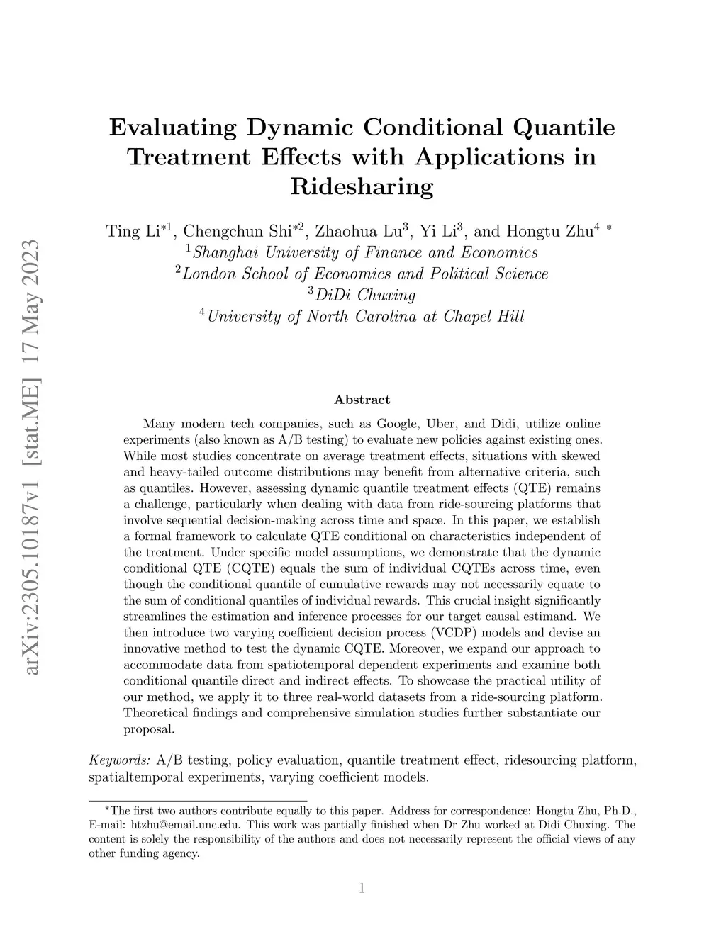 Many modern tech companies, such as Google, Uber, and Didi, utilize online experiments (also known as A/B testing) to evaluate new policies against existing ones. While most studies concentrate on average treatment effects, situations with skewed and heavy-tailed outcome distributions may benefit from alternative criteria, such as quantiles. However, assessing dynamic quantile treatment effects (QTE) remains a challenge, particularly when dealing with data from ride-sourcing platforms that involve sequential decision-making across time and space. In this paper, we establish a formal framework to calculate QTE conditional on characteristics independent of the treatment. Under specific model assumptions, we demonstrate that the dynamic conditional QTE (CQTE) equals the sum of individual CQTEs across time, even though the conditional quantile of cumulative rewards may not necessarily equate to the sum of conditional quantiles of individual rewards. This crucial insight significantly streamlines the estimation and inference processes for our target causal estimand. We then introduce two varying coefficient decision process (VCDP) models and devise an innovative method to test the dynamic CQTE. Moreover, we expand our approach to accommodate data from spatiotemporal dependent experiments and examine both conditional quantile direct and indirect effects. To showcase the practical utility of our method, we apply it to three real-world datasets from a ride-sourcing platform. Theoretical findings and comprehensive simulation studies further substantiate our proposal.
