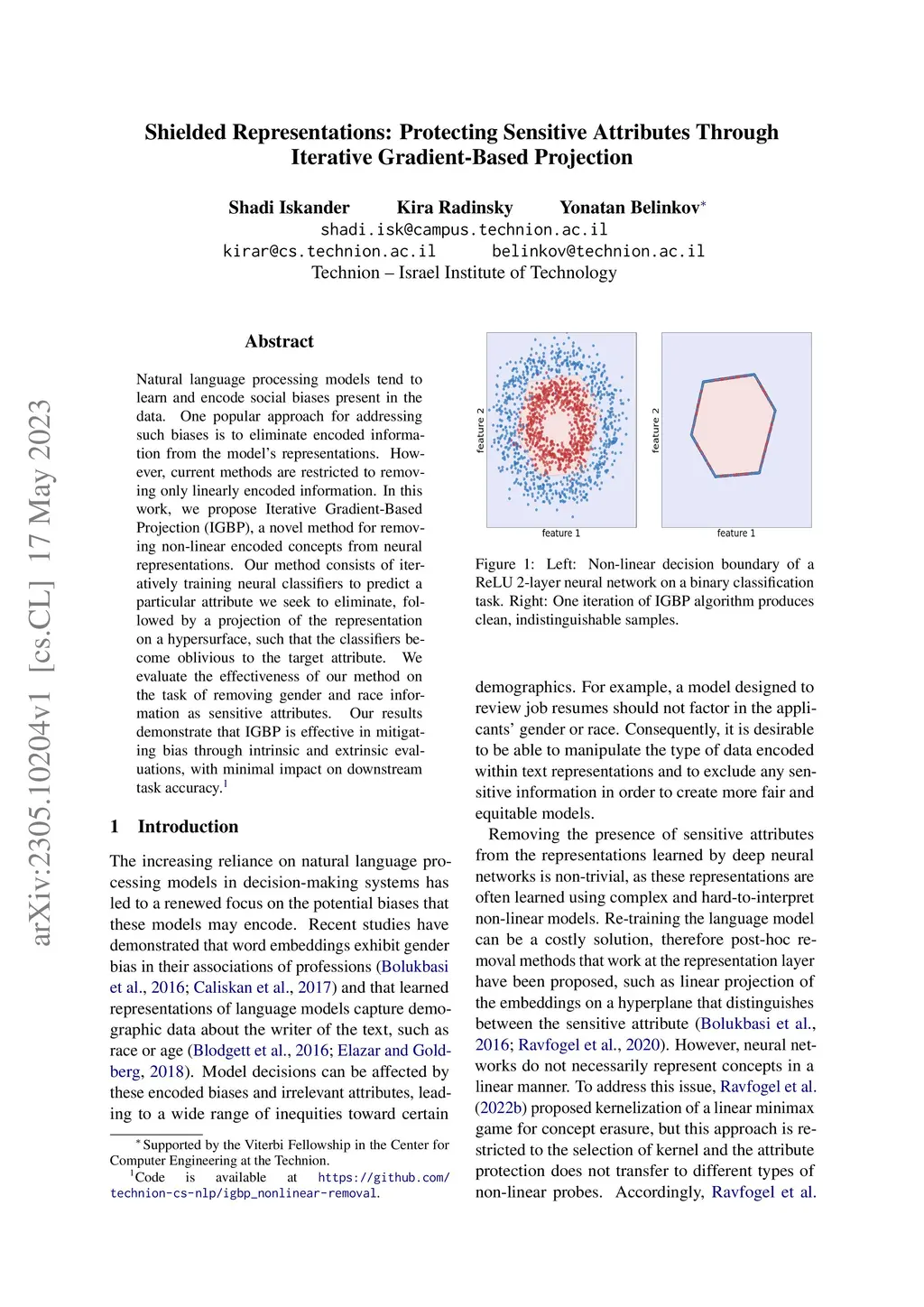 Natural language processing models tend to learn and encode social biases present in the data. One popular approach for addressing such biases is to eliminate encoded information from the model's representations. However, current methods are restricted to removing only linearly encoded information. In this work, we propose Iterative Gradient-Based Projection (IGBP), a novel method for removing non-linear encoded concepts from neural representations. Our method consists of iteratively training neural classifiers to predict a particular attribute we seek to eliminate, followed by a projection of the representation on a hypersurface, such that the classifiers become oblivious to the target attribute. We evaluate the effectiveness of our method on the task of removing gender and race information as sensitive attributes. Our results demonstrate that IGBP is effective in mitigating bias through intrinsic and extrinsic evaluations, with minimal impact on downstream task accuracy.