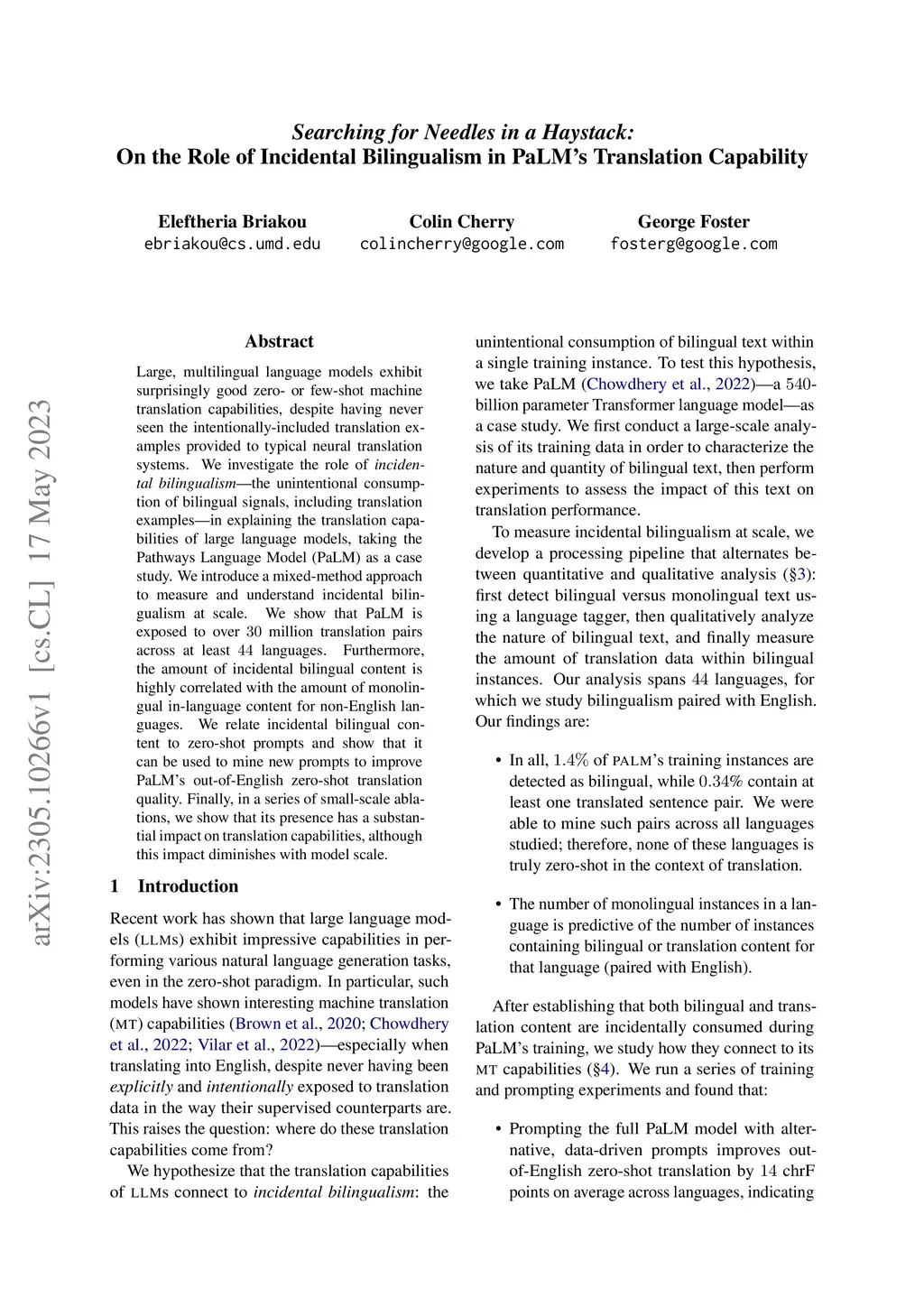 Large, multilingual language models exhibit surprisingly good zero- or few-shot machine translation capabilities, despite having never seen the intentionally-included translation examples provided to typical neural translation systems. We investigate the role of incidental bilingualism -- the unintentional consumption of bilingual signals, including translation examples -- in explaining the translation capabilities of large language models, taking the Pathways Language Model (PaLM) as a case study. We introduce a mixed-method approach to measure and understand incidental bilingualism at scale. We show that PaLM is exposed to over 30 million translation pairs across at least 44 languages. Furthermore, the amount of incidental bilingual content is highly correlated with the amount of monolingual in-language content for non-English languages. We relate incidental bilingual content to zero-shot prompts and show that it can be used to mine new prompts to improve PaLM's out-of-English zero-shot translation quality. Finally, in a series of small-scale ablations, we show that its presence has a substantial impact on translation capabilities, although this impact diminishes with model scale.