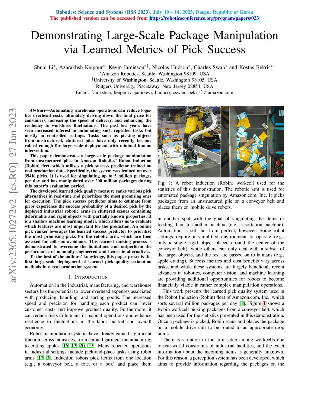 Automating warehouse operations can reduce logistics overhead costs, ultimately driving down the final price for consumers, increasing the speed of delivery, and enhancing the resiliency to workforce fluctuations. The past few years have seen increased interest in automating such repeated tasks but mostly in controlled settings. Tasks such as picking objects from unstructured, cluttered piles have only recently become robust enough for large-scale deployment with minimal human intervention. This paper demonstrates a large-scale package manipulation from unstructured piles in Amazon Robotics' Robot Induction (Robin) fleet, which utilizes a pick success predictor trained on real production data. Specifically, the system was trained on over 394K picks. It is used for singulating up to 5~million packages per day and has manipulated over 200~million packages during this paper's evaluation period. The developed learned pick quality measure ranks various pick alternatives in real-time and prioritizes the most promising ones for execution. The pick success predictor aims to estimate from prior experience the success probability of a desired pick by the deployed industrial robotic arms in cluttered scenes containing deformable and rigid objects with partially known properties. It is a shallow machine learning model, which allows us to evaluate which features are most important for the prediction. An online pick ranker leverages the learned success predictor to prioritize the most promising picks for the robotic arm, which are then assessed for collision avoidance. This learned ranking process is demonstrated to overcome the limitations and outperform the performance of manually engineered and heuristic alternatives. To the best of the authors' knowledge, this paper presents the first large-scale deployment of learned pick quality estimation methods in a real production system.