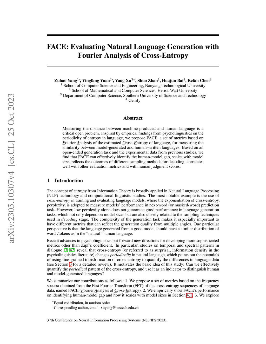 Measuring the distance between machine-produced and human language is a critical open problem. Inspired by empirical findings from psycholinguistics on the periodicity of entropy in language, we propose FACE, a set of metrics based on Fourier Analysis of the estimated Cross-Entropy of language, for measuring the similarity between model-generated and human-written languages. Based on an open-ended generation task and the experimental data from previous studies, we find that FACE can effectively identify the human-model gap, scales with model size, reflects the outcomes of different sampling methods for decoding, correlates well with other evaluation metrics and with human judgment scores.