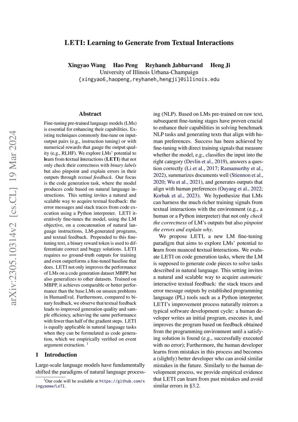 Fine-tuning pre-trained language models (LMs) is essential for enhancing their capabilities. Existing techniques commonly fine-tune on input-output pairs (e.g., instruction tuning) or with numerical rewards that gauge the output quality (e.g., RLHF). We explore LMs' potential to learn from textual interactions (LETI) that not only check their correctness with binary labels but also pinpoint and explain errors in their outputs through textual feedback. Our focus is the code generation task, where the model produces code based on natural language instructions. This setting invites a natural and scalable way to acquire textual feedback: the error messages and stack traces from code execution using a Python interpreter. LETI iteratively fine-tunes the model, using the LM objective, on a concatenation of natural language instructions, LM-generated programs, and textual feedback. Prepended to this fine-tuning text, a binary reward token is used to differentiate correct and buggy solutions. LETI requires no ground-truth outputs for training and even outperforms a fine-tuned baseline that does. LETI not only improves the performance of LMs on a code generation dataset MBPP, but also generalizes to other datasets. Trained on MBPP, it achieves comparable or better performance than the base LMs on unseen problems in HumanEval. Furthermore, compared to binary feedback, we observe that textual feedback leads to improved generation quality and sample efficiency, achieving the same performance with fewer than half of the gradient steps. LETI is equally applicable in natural language tasks when they can be formulated as code generation, which we empirically verified on event argument extraction.