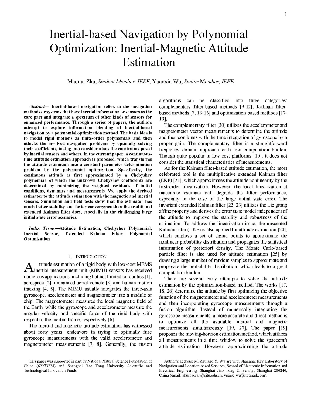 Inertial-based navigation refers to the navigation methods or systems that have inertial information or sensors as the core part and integrate a spectrum of other kinds of sensors for enhanced performance. Through a series of papers, the authors attempt to explore information blending of inertial-based navigation by a polynomial optimization method. The basic idea is to model rigid motions as finite-order polynomials and then attacks the involved navigation problems by optimally solving their coefficients, taking into considerations the constraints posed by inertial sensors and others. In the current paper, a continuous-time attitude estimation approach is proposed, which transforms the attitude estimation into a constant parameter determination problem by the polynomial optimization. Specifically, the continuous attitude is first approximated by a Chebyshev polynomial, of which the unknown Chebyshev coefficients are determined by minimizing the weighted residuals of initial conditions, dynamics and measurements. We apply the derived estimator to the attitude estimation with the magnetic and inertial sensors. Simulation and field tests show that the estimator has much better stability and faster convergence than the traditional extended Kalman filter does, especially in the challenging large initial state error scenarios.