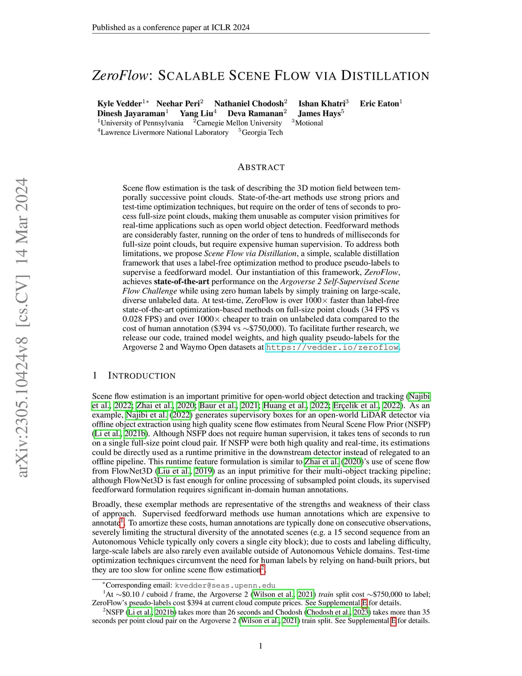 Scene flow estimation is the task of describing the 3D motion field between temporally successive point clouds. State-of-the-art methods use strong priors and test-time optimization techniques, but require on the order of tens of seconds to process full-size point clouds, making them unusable as computer vision primitives for real-time applications such as open world object detection. Feedforward methods are considerably faster, running on the order of tens to hundreds of milliseconds for full-size point clouds, but require expensive human supervision. To address both limitations, we propose Scene Flow via Distillation, a simple, scalable distillation framework that uses a label-free optimization method to produce pseudo-labels to supervise a feedforward model. Our instantiation of this framework, ZeroFlow, achieves state-of-the-art performance on the Argoverse 2 Self-Supervised Scene Flow Challenge while using zero human labels by simply training on large-scale, diverse unlabeled data. At test-time, ZeroFlow is over 1000x faster than label-free state-of-the-art optimization-based methods on full-size point clouds (34 FPS vs 0.028 FPS) and over 1000x cheaper to train on unlabeled data compared to the cost of human annotation (\394 vs ~\750,000). To facilitate further research, we release our code, trained model weights, and high quality pseudo-labels for the Argoverse 2 and Waymo Open datasets at https://vedder.io/zeroflow.html