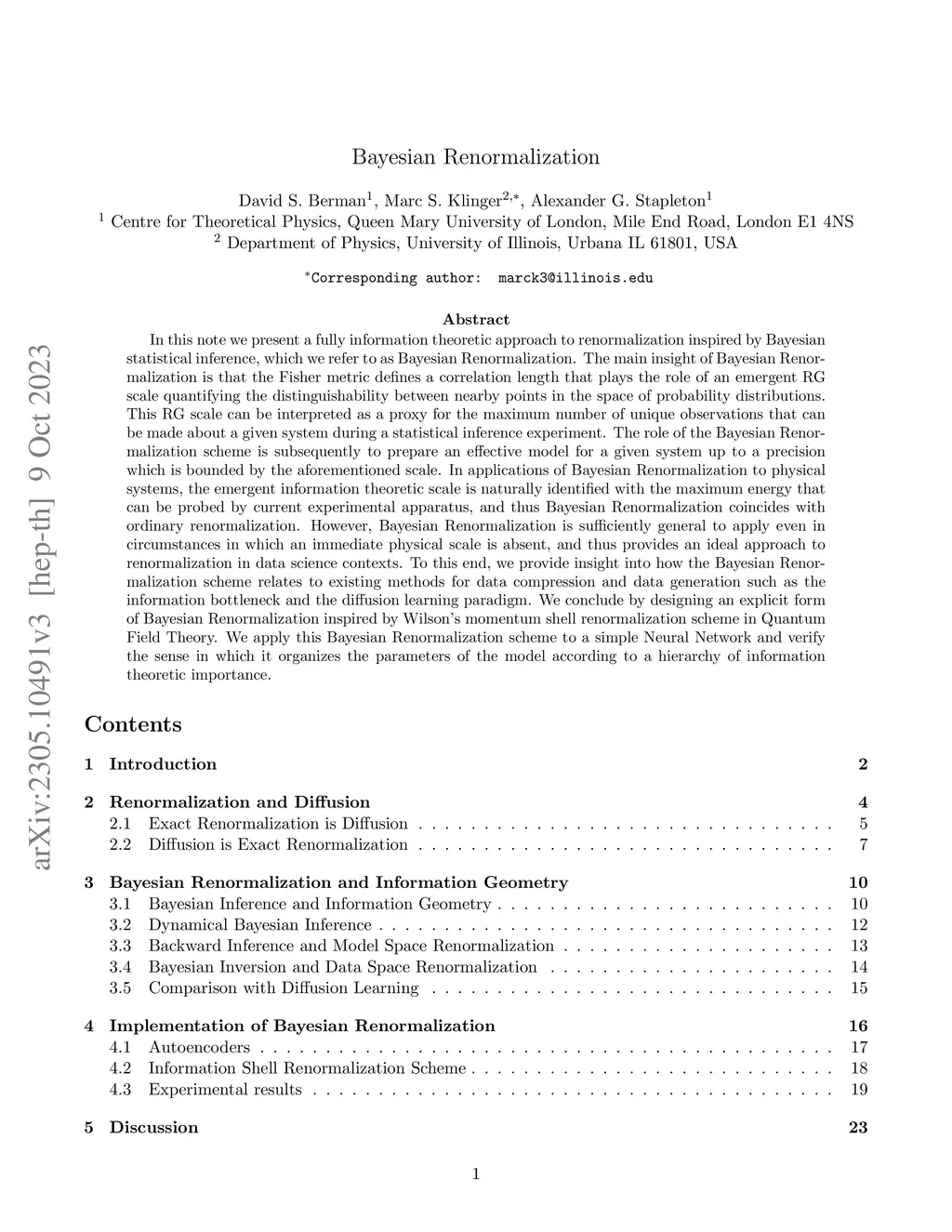 In this note we present a fully information theoretic approach to renormalization inspired by Bayesian statistical inference, which we refer to as Bayesian Renormalization. The main insight of Bayesian Renormalization is that the Fisher metric defines a correlation length that plays the role of an emergent RG scale quantifying the distinguishability between nearby points in the space of probability distributions. This RG scale can be interpreted as a proxy for the maximum number of unique observations that can be made about a given system during a statistical inference experiment. The role of the Bayesian Renormalization scheme is subsequently to prepare an effective model for a given system up to a precision which is bounded by the aforementioned scale. In applications of Bayesian Renormalization to physical systems, the emergent information theoretic scale is naturally identified with the maximum energy that can be probed by current experimental apparatus, and thus Bayesian Renormalization coincides with ordinary renormalization. However, Bayesian Renormalization is sufficiently general to apply even in circumstances in which an immediate physical scale is absent, and thus provides an ideal approach to renormalization in data science contexts. To this end, we provide insight into how the Bayesian Renormalization scheme relates to existing methods for data compression and data generation such as the information bottleneck and the diffusion learning paradigm. We conclude by designing an explicit form of Bayesian Renormalization inspired by Wilson's momentum shell renormalization scheme in Quantum Field Theory. We apply this Bayesian Renormalization scheme to a simple Neural Network and verify the sense in which it organizes the parameters of the model according to a hierarchy of information theoretic importance.