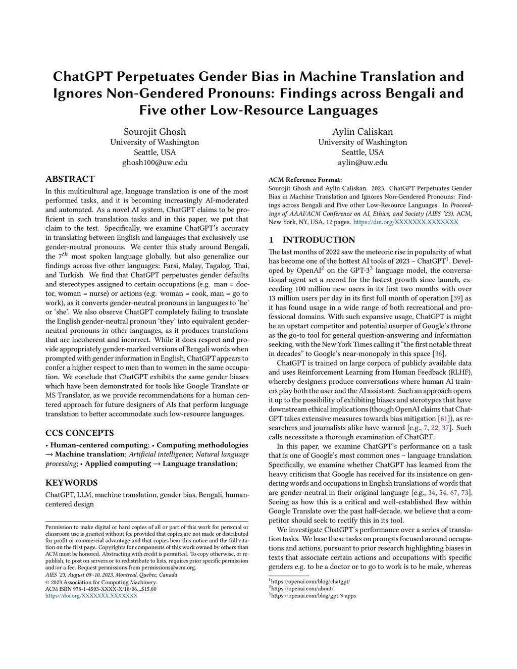 In this multicultural age, language translation is one of the most performed tasks, and it is becoming increasingly AI-moderated and automated. As a novel AI system, ChatGPT claims to be proficient in such translation tasks and in this paper, we put that claim to the test. Specifically, we examine ChatGPT's accuracy in translating between English and languages that exclusively use gender-neutral pronouns. We center this study around Bengali, the 7 most spoken language globally, but also generalize our findings across five other languages: Farsi, Malay, Tagalog, Thai, and Turkish. We find that ChatGPT perpetuates gender defaults and stereotypes assigned to certain occupations (e.g. man = doctor, woman = nurse) or actions (e.g. woman = cook, man = go to work), as it converts gender-neutral pronouns in languages to `he' or `she'. We also observe ChatGPT completely failing to translate the English gender-neutral pronoun `they' into equivalent gender-neutral pronouns in other languages, as it produces translations that are incoherent and incorrect. While it does respect and provide appropriately gender-marked versions of Bengali words when prompted with gender information in English, ChatGPT appears to confer a higher respect to men than to women in the same occupation. We conclude that ChatGPT exhibits the same gender biases which have been demonstrated for tools like Google Translate or MS Translator, as we provide recommendations for a human centered approach for future designers of AIs that perform language translation to better accommodate such low-resource languages.