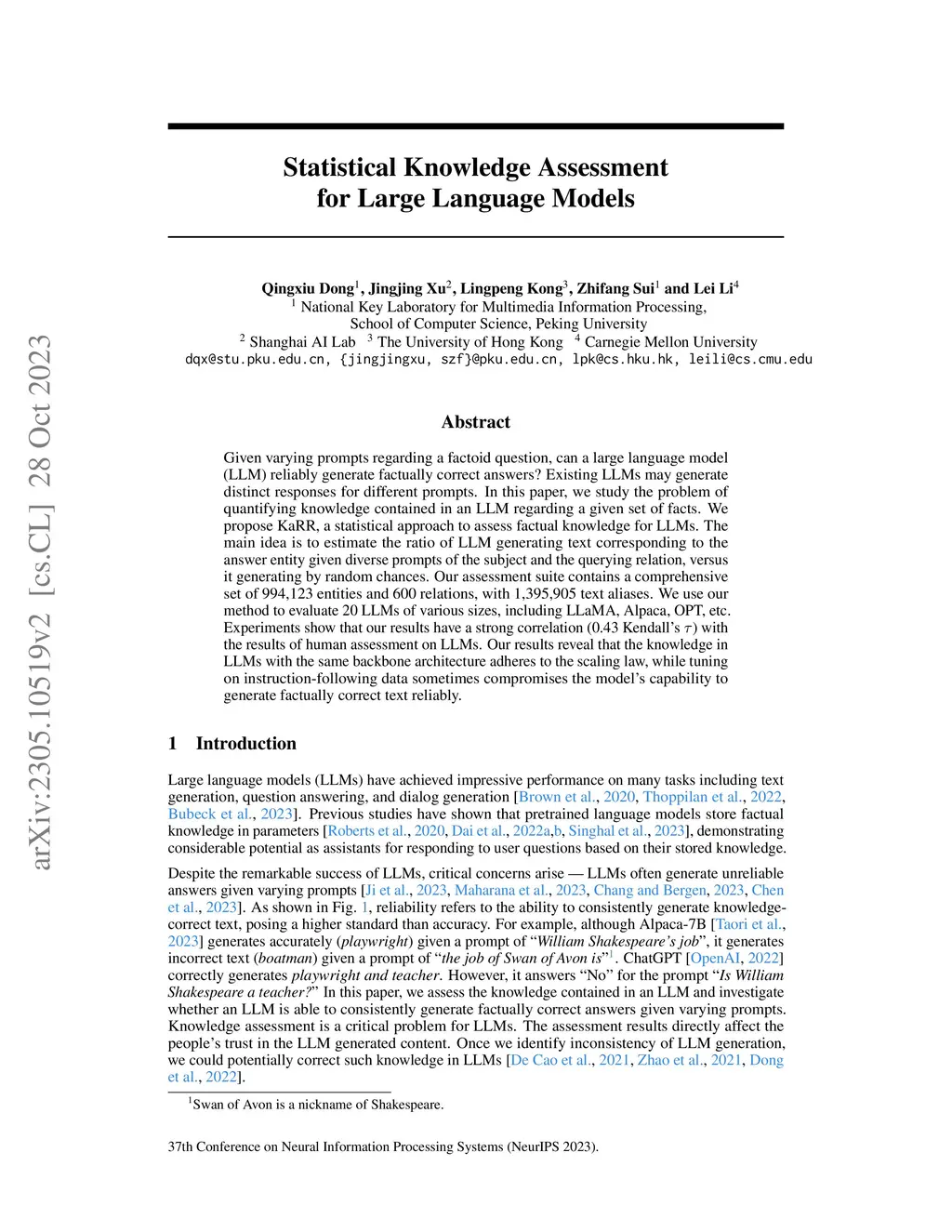 Given varying prompts regarding a factoid question, can a large language model (LLM) reliably generate factually correct answers? Existing LLMs may generate distinct responses for different prompts. In this paper, we study the problem of quantifying knowledge contained in an LLM regarding a given set of facts. We propose KaRR, a statistical approach to assess factual knowledge for LLMs. The main idea is to estimate the ratio of LLM generating text corresponding to the answer entity given diverse prompts of the subject and the querying relation, versus it generating by random chances. Our assessment suite contains a comprehensive set of 994,123 entities and 600 relations, with 1,395,905 text aliases. We use our method to evaluate 20 LLMs of various sizes, including LLaMA, Alpaca, OPT, etc. Experiments show that our results have a strong correlation (0.43 Kendall's ) with the results of human assessment on LLMs. Our results reveal that the knowledge in LLMs with the same backbone architecture adheres to the scaling law, while tuning on instruction-following data sometimes compromises the model's capability to generate factually correct text reliably.