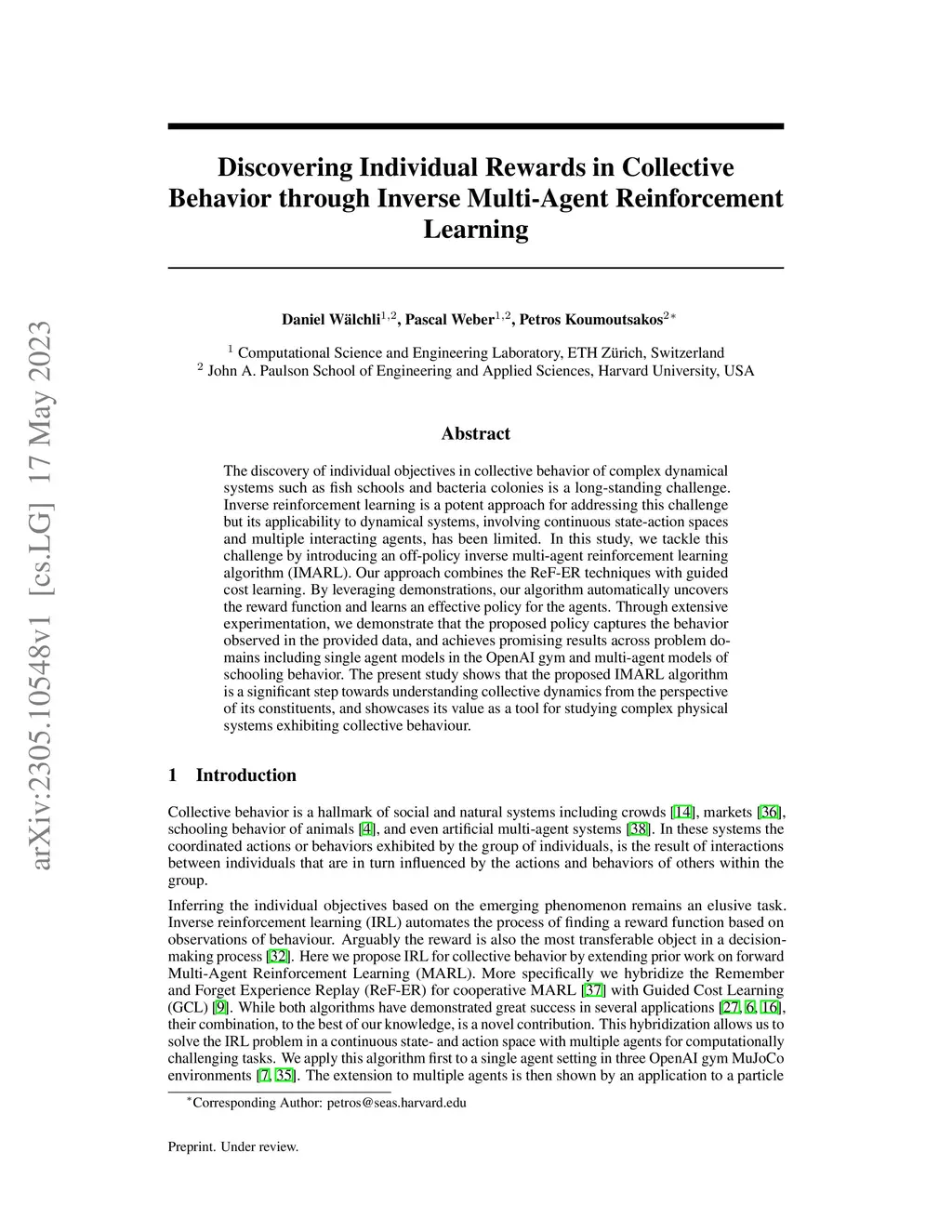 The discovery of individual objectives in collective behavior of complex dynamical systems such as fish schools and bacteria colonies is a long-standing challenge. Inverse reinforcement learning is a potent approach for addressing this challenge but its applicability to dynamical systems, involving continuous state-action spaces and multiple interacting agents, has been limited. In this study, we tackle this challenge by introducing an off-policy inverse multi-agent reinforcement learning algorithm (IMARL). Our approach combines the ReF-ER techniques with guided cost learning. By leveraging demonstrations, our algorithm automatically uncovers the reward function and learns an effective policy for the agents. Through extensive experimentation, we demonstrate that the proposed policy captures the behavior observed in the provided data, and achieves promising results across problem domains including single agent models in the OpenAI gym and multi-agent models of schooling behavior. The present study shows that the proposed IMARL algorithm is a significant step towards understanding collective dynamics from the perspective of its constituents, and showcases its value as a tool for studying complex physical systems exhibiting collective behaviour.