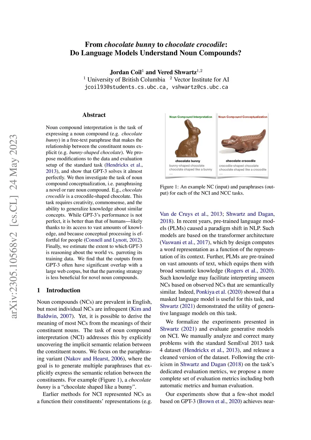 Noun compound interpretation is the task of expressing a noun compound (e.g. chocolate bunny) in a free-text paraphrase that makes the relationship between the constituent nouns explicit (e.g. bunny-shaped chocolate). We propose modifications to the data and evaluation setup of the standard task (Hendrickx et al., 2013), and show that GPT-3 solves it almost perfectly. We then investigate the task of noun compound conceptualization, i.e. paraphrasing a novel or rare noun compound. E.g., chocolate crocodile is a crocodile-shaped chocolate. This task requires creativity, commonsense, and the ability to generalize knowledge about similar concepts. While GPT-3's performance is not perfect, it is better than that of humans -- likely thanks to its access to vast amounts of knowledge, and because conceptual processing is effortful for people (Connell and Lynott, 2012). Finally, we estimate the extent to which GPT-3 is reasoning about the world vs. parroting its training data. We find that the outputs from GPT-3 often have significant overlap with a large web corpus, but that the parroting strategy is less beneficial for novel noun compounds.