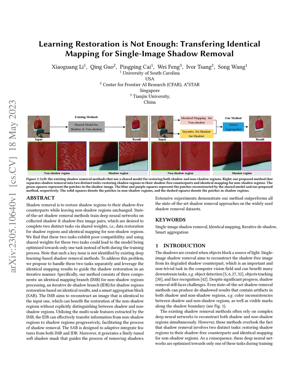 Shadow removal is to restore shadow regions to their shadow-free counterparts while leaving non-shadow regions unchanged. State-of-the-art shadow removal methods train deep neural networks on collected shadow & shadow-free image pairs, which are desired to complete two distinct tasks via shared weights, i.e., data restoration for shadow regions and identical mapping for non-shadow regions. We find that these two tasks exhibit poor compatibility, and using shared weights for these two tasks could lead to the model being optimized towards only one task instead of both during the training process. Note that such a key issue is not identified by existing deep learning-based shadow removal methods. To address this problem, we propose to handle these two tasks separately and leverage the identical mapping results to guide the shadow restoration in an iterative manner. Specifically, our method consists of three components: an identical mapping branch (IMB) for non-shadow regions processing, an iterative de-shadow branch (IDB) for shadow regions restoration based on identical results, and a smart aggregation block (SAB). The IMB aims to reconstruct an image that is identical to the input one, which can benefit the restoration of the non-shadow regions without explicitly distinguishing between shadow and non-shadow regions. Utilizing the multi-scale features extracted by the IMB, the IDB can effectively transfer information from non-shadow regions to shadow regions progressively, facilitating the process of shadow removal. The SAB is designed to adaptive integrate features from both IMB and IDB. Moreover, it generates a finely tuned soft shadow mask that guides the process of removing shadows. Extensive experiments demonstrate our method outperforms all the state-of-the-art shadow removal approaches on the widely used shadow removal datasets.